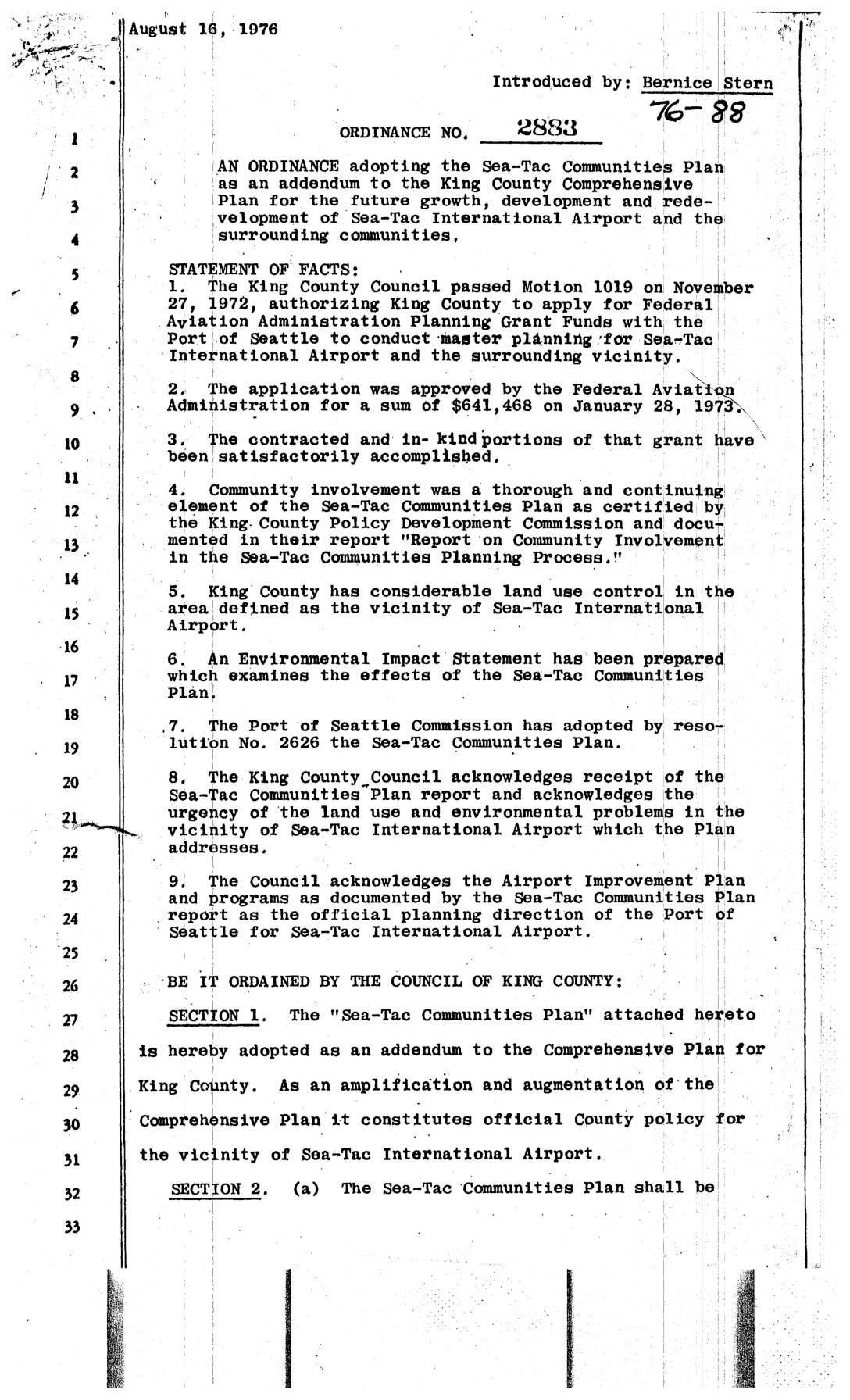 AN ORDINANCE adopting the Sea-Tac Conununi tie~ PJab; !·as an addendum to the King County Comprehens;ive I i Plan for the future growth, development and rede- 1 ' ,,,velopment of· Sea-Tac International Airport apd ~he1 surrounding communi ties, , I ! S'FAT~MENT OF' FACTS: . I i 1. The King County Council passed Motion 1019 on NoVi ember 27, ~972, authorizing King County to apply for Federa:l 1 ' . Aviation Administration Planning ·Grant Funds with th~ . Por.t :.of Seattle to conduct ·master pl.nnirtg :for Se~~T~c 1 • ·International Airport and the _surrounding vicinity .. J i 2.. 'fhe application was approved by the Federal A:Viatti):n Administration for a sum of $641,468 on January 28, ~973'_,, .. • I I' "· ' ', I I • I '! i '. 3. The contracted and in- kind portions of that gran'tl ~ave been! satisfactorily accomplisbed. . j !'' ! 4. Community involvement was a: thorough ·and conttnu~·ng! · elf:'ment of the Sea-Tac Communi~ies Plan as certif'ied jby the ~ing. County Policy Development Commission and: doeu·h ment~d in their report "Report ·on Community Invol;vemdnt: in the sea-Tac C~unities Planning Process.!' ! I ! ' . . I' • I 5. King· County has considerable land use controlj in the . :i~~~~~~;lned as_ the vicinity of ~e~-Tac Internatilonalll i i , I 6. ~n Environmental Impact· Statement has· been pr'epaljed: which examines the effects of the Sea-Tac Communilties ! ' Plani · .. I 1 . . • I : .7. The…