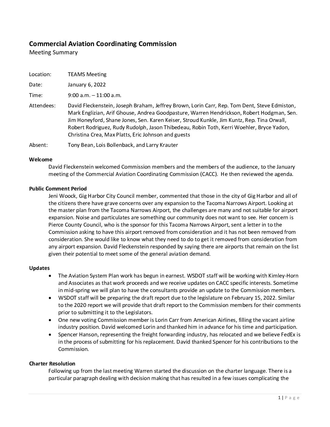 Attendees: David Fleckenstein, Joseph Braham, Jeffrey Brown, Lorin Carr, Rep. Tom Dent, Steve Edmiston, Mark Englizian, Arif Ghouse, Andrea Goodpasture, Warren Hendrickson, Robert Hodgman, Sen. Jim Honeyford, Shane Jones, Sen. Karen Keiser, Stroud Kunkle, Jim Kuntz, Rep. Tina Orwall, Robert Rodriguez, Rudy Rudolph, Jason Thibedeau, Robin Toth, Kerri Woehler, Bryce Yadon, Christina Crea, Max Platts, Eric Johnson and guests Absent: Tony Bean, Lois Bollenback, and Larry Krauter Welcome David Fleckenstein welcomed Commission members and the members of the audience, to the January meeting of the Commercial Aviation Coordinating Commission (CACC). He then reviewed the agenda. Public Comment Period Jeni Woock, Gig Harbor City Council member, commented that those in the city of Gig Harbor and all of the citizens there have grave concerns over any expansion to the Tacoma Narrows Airport. Looking at the master plan from the Tacoma Narrows Airport, the challenges are many and not suitable for airport expansion. Noise and particulates are something our community does not want to see. Her concern is Pierce County Council, who is the sponsor for this Tacoma Narrows Airport, sent a letter in to the Commission asking to have this airport removed from consideration and it has not been removed from consideration. She would like to know what they need to do to get it removed from consideration from any airport expansion. David Fleckenstein responded by saying there are airports that remain on the list given their potential to meet some of the general aviation demand. Updates • The Aviation System…