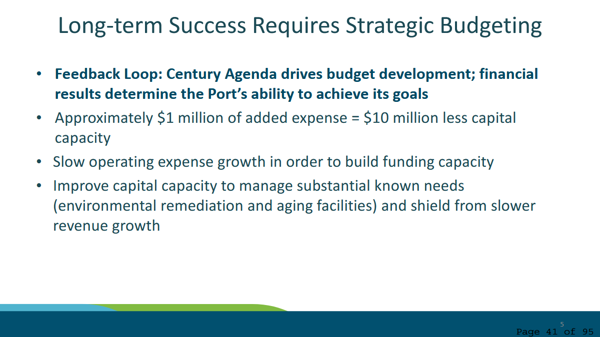 The mission of the Port of Seattle is to create economic opportunity and stronger communities by advancing trade and commerce, promoting manufacturing and maritime growth, and improving our environment for current and future generations. Our vision is to add 100,000 jobs through economic growth led by the Port, for a total of 300,000 port-related jobs in the region, while reducing our environmental footprint. We are committed to creating opportunity for all, partnering with surrounding communities, promoting social respon- sibility, conducting ourselves transparently, and holding ourselves accountable for improving the environment. The Port of Seattle uses a rolling 5-year Long Range Plan (LRP) to focus our efforts on job growth and strategic objectives established by the Commission in the Century Agenda (see page 5). Over the last two years, the LRP has helped the Port align programs to achieve the Port’s Century Agenda. For each strategic objective, the LRP sets out the key actions and performance mea- sures to guide the work and monitor progress. All Port divisions participate in the LRP through cross-departmental teams formed around strategic objectives. The LRP shapes the annual budget and ensures that all Port divisions have specific, achievable actions to keep up with the dramatic growth in our industries and create economic opportunities for all in our community. The intention of the LRP is to bring all capabilities of the Port to bear in the work of achieving the economic and environmental goals that the Commission and public have identified as most pressing for our… -
