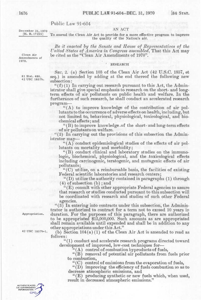 December 31 , 1970 A N A C T [H. R. 17255] Xo amend the Clean Air Act to provide for a more effective program to improve the quality of the Nation's air. Be it enacted hy the Seriate and House of Bepresentatives of the United States of America in Congress asseinbled^ That this Act may be cited as the "Clean Air Amendments of 1970". Clean Air Amendments of 1970. Stat. 486. u s e 1857b. Appropriation. u s e 1857b-l . RESEARCH SEC. 2. (a) Section 103 of the Clean Air Act (42 U.S.C. 1857, et seq.) is amended by adding at the end thereof the following new subsection: "(f) (1) In cari*ying out research pursuant to this Act, the Admin- istrator shall give special emphasis to research on the short- and long- term effects of air pollutants on public health and welfare. In the furtherance of such research, he shall conduct an accelerated research program— "(A) to improve knowledge of the contribution of air pol- lutants to the occurrence of adverse effects on health, including, but not limited to, behavioral, physiological, toxicological, and bio- chemical effects; and " (B) to improve knowledge.of the short-and long-term effects of air pollutants on welfare. "(2) In carrying out the provisions of this subsection the Admin- istrator may— " (A) conduct epidemiological studies of the effects of air pol- lutants on mortality and morbidity; " (B) conduct clinical and laboratory studies on the immuno- logic, biochemical, physiological, and the toxicological effects including…
