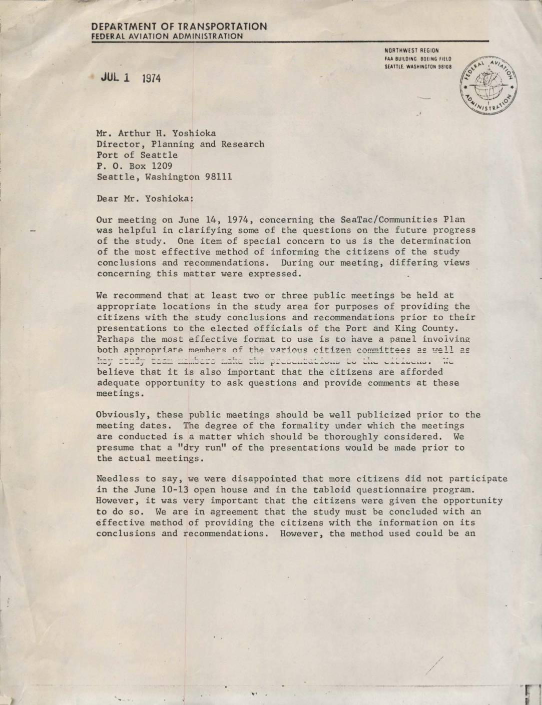 FAA Letter G. Buley to Arthur Yoshioka re. public outreach
