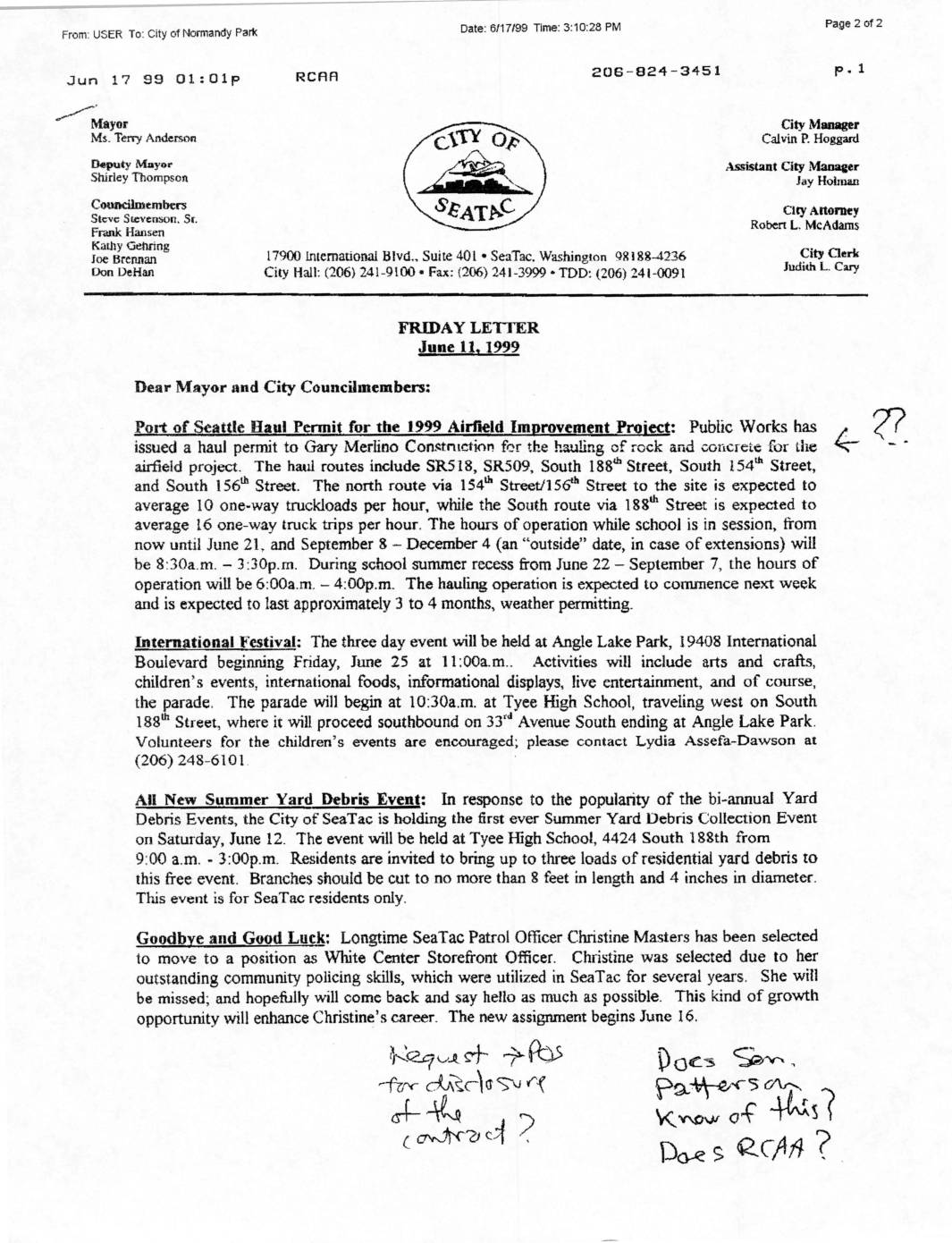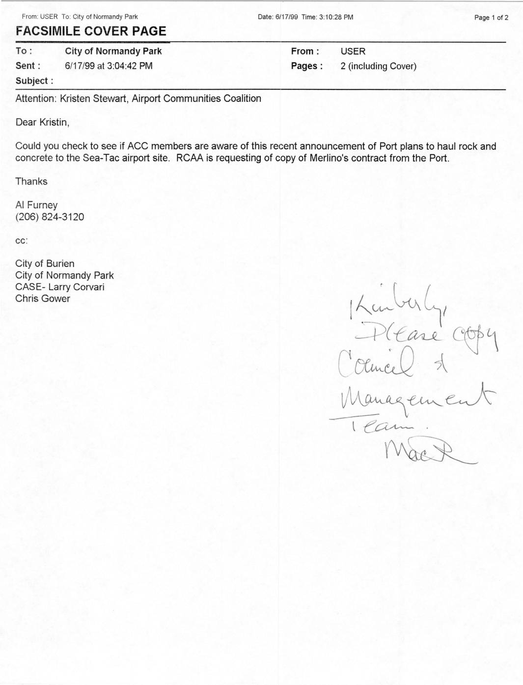 From: USER To: City of Normandy Park Date: 6/1 7/99 Time: 3:10:28 PM Page 1 of 2 FACSIMILE COVER PAGE To : City of Normandy Park Sent : 6/1 7/99 at 3:04:42 PM Subject : From : Pages : USER (including Cover) Attention: Kristen Stewart, Airport Communities Coalition Dear Kristin, Could you check to see if ACC members are aware of this recent announcement of Port plans to haul rock and concrete to the Sea-Tac airport site. RCAA is requesting of copy of Merlino's contract from the Port. Thanks Al Furney (206) 824-3120 CC : City of Burien City of Normandy Park CASE- Larry Corvari Chris Gower -