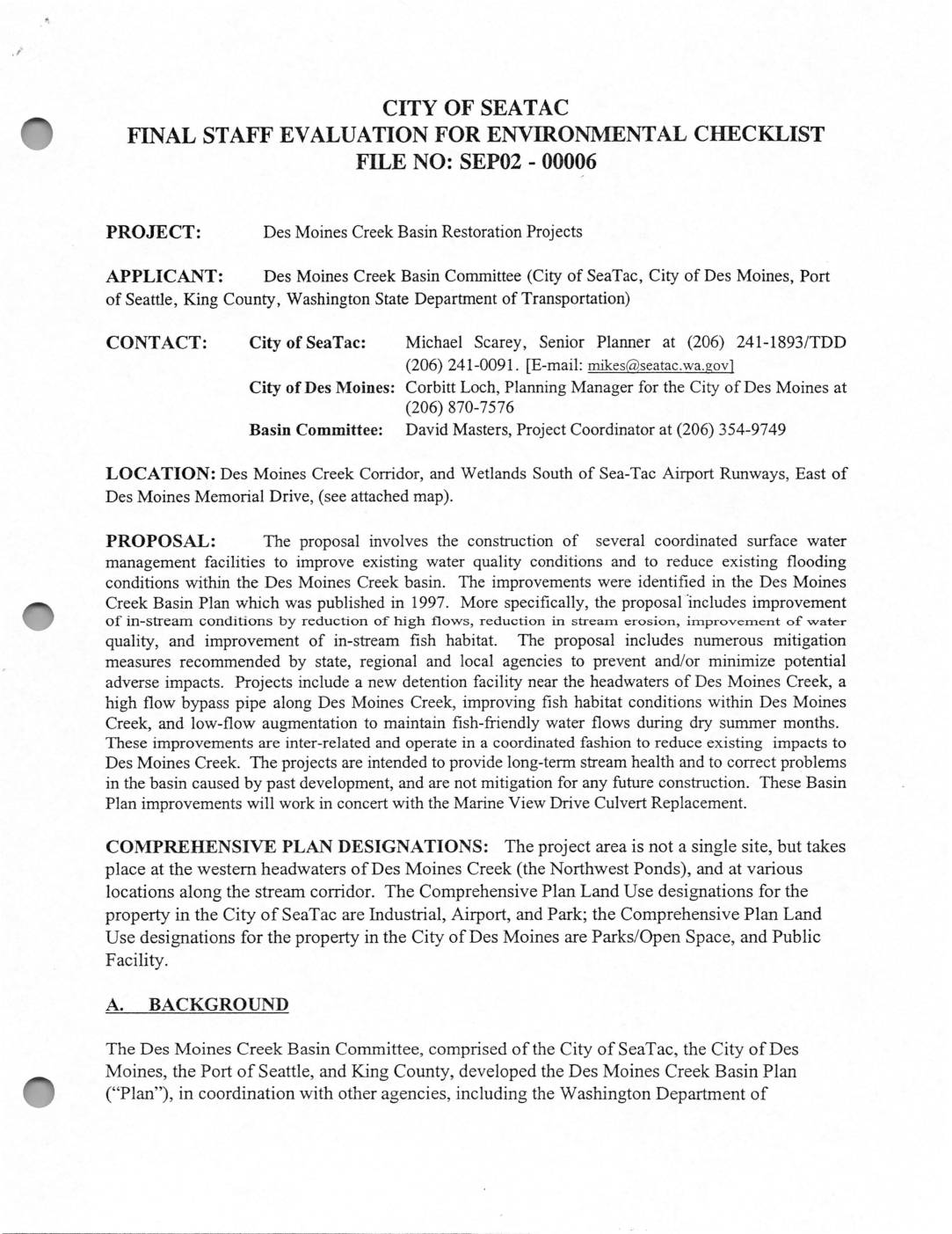 PROJECT: Des Moines Creek Basin Restoration Projects APPLICANT: Des Moines Creek Basin Cornmittee (city of SeaTac, city of Des Moines, Port of Seattle, King County, Washington State Department of Transportation) CONTACT: City of SeaTac: Michael Scarey, Senior Planner at (206) 241-1893/TDD (206) 241-0091 . Corbin Loch, Planning Manager for the City of Des Moines at (206) 870-7576 David Masters, Project Coordinator at (206) 354-9749 [E-mail: mikes(@seatac.wa.gov City of Des Moines: Basin Committee: LOCATION: Des Moines Creek Corridor, and Wetlands South of Sea-Tac Airport Runways, East of Des Moines Memorial Drive, (see attached map). PROPOSAL: The proposal involves the construction of several coordinated surface water management facilities to improve existing water quality conditions and to reduce existing flooding conditions within the Des Moines Creek basin. The irnprovements were identified in the Des Moines Creek Basin Plan which was published in 1997. More specifically, the proposal includes improvement of in-stream conditions by reduction of high flows, reduction in stream erosion, improvement of water quality, and improvement of in-stream fish habitat. The proposal includes numerous mitigation measures recommended by state, regional and local agencies to prevent and/or minimize potential adverse impacts. Projects include a new detention facility near the headwaters of Des Moines Creek, a high flow bypass pipe along Des Moines Creek, improving fish habitat conditions within Des Moines Creek, and low-flow augmentation to maintain fish-friendly water flows during dry summer months. These improvements are inter-related and operate in a coordinated fashion to reduce existing impacts to Des Moines (-"reek. The projects…