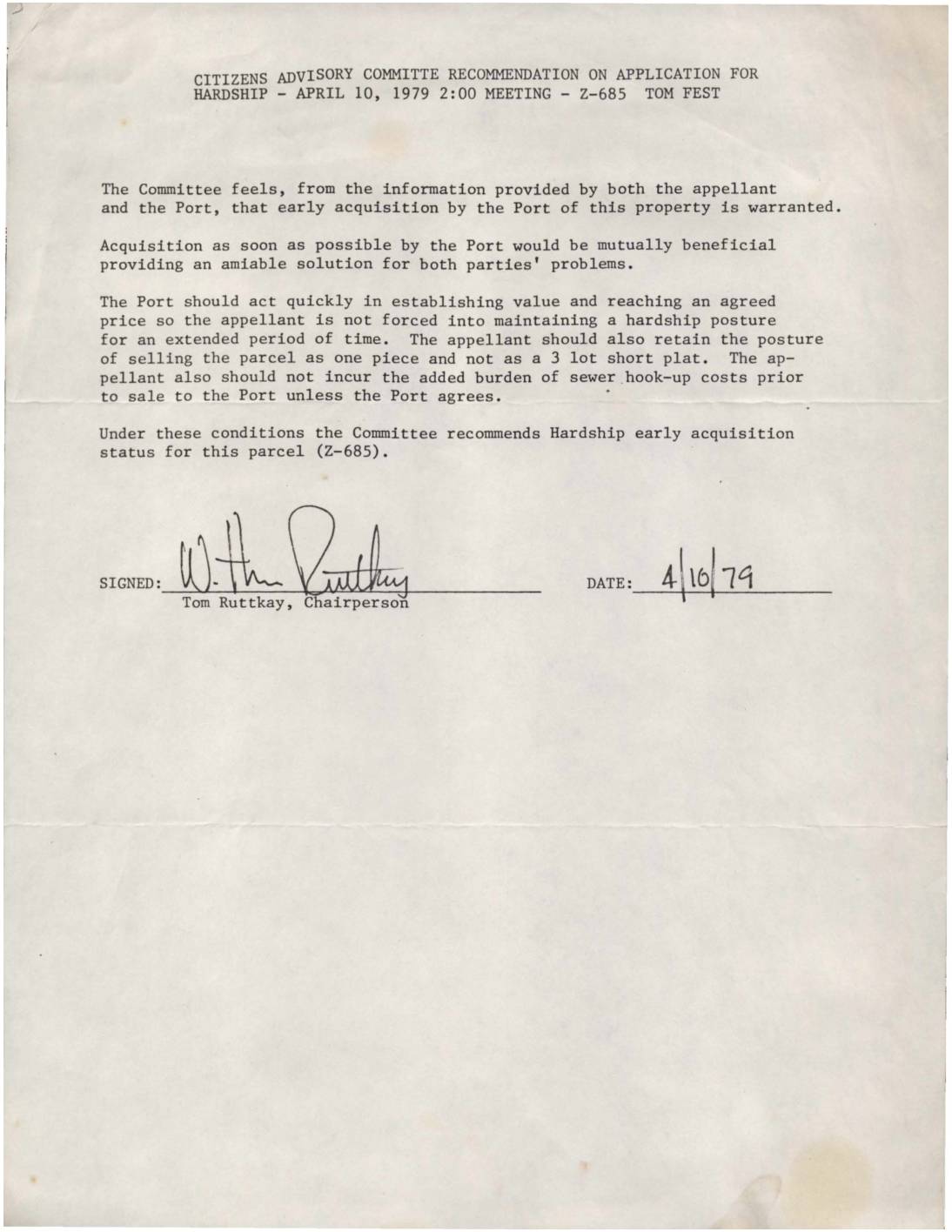 Citizens Advisory Committee recommendation supporting hardship early acquisition status for property Z-685 owned by Tom Fest. The Committee recommends the Port quickly establish value and reach an agreed price for mutual benefit of both parties.