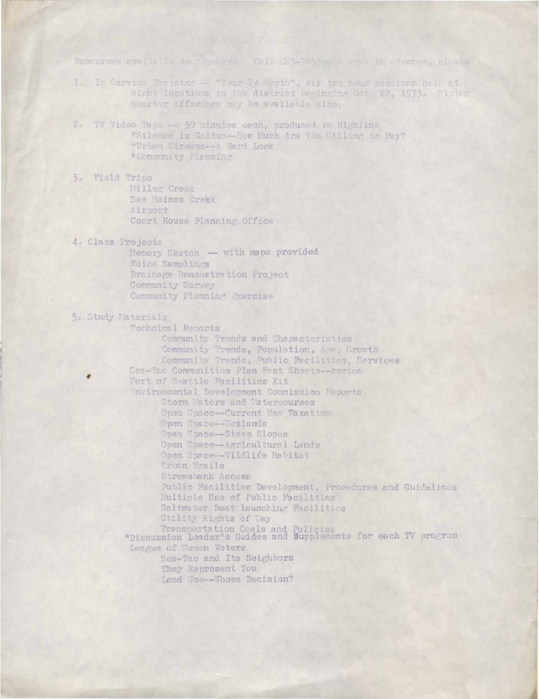 This document appears to be course materials or study guide listing various topics including TV shows, field trips to locations like Killer Creek and Des Moines Creek, class projects involving memory sketches and community surveys, and study materials covering technical reports, community trends, and various planning topics. -