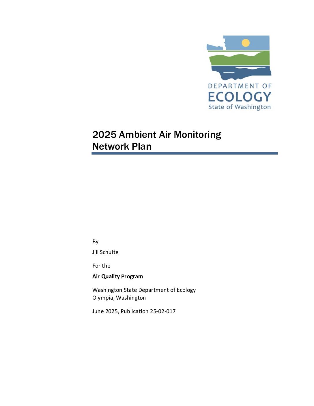 A network plan for ambient air monitoring by the Air Quality Program of the Washington State Department of Ecology. The document outlines contact information, regional office structure, and accessibility policies for the department’s air quality monitoring initiatives.