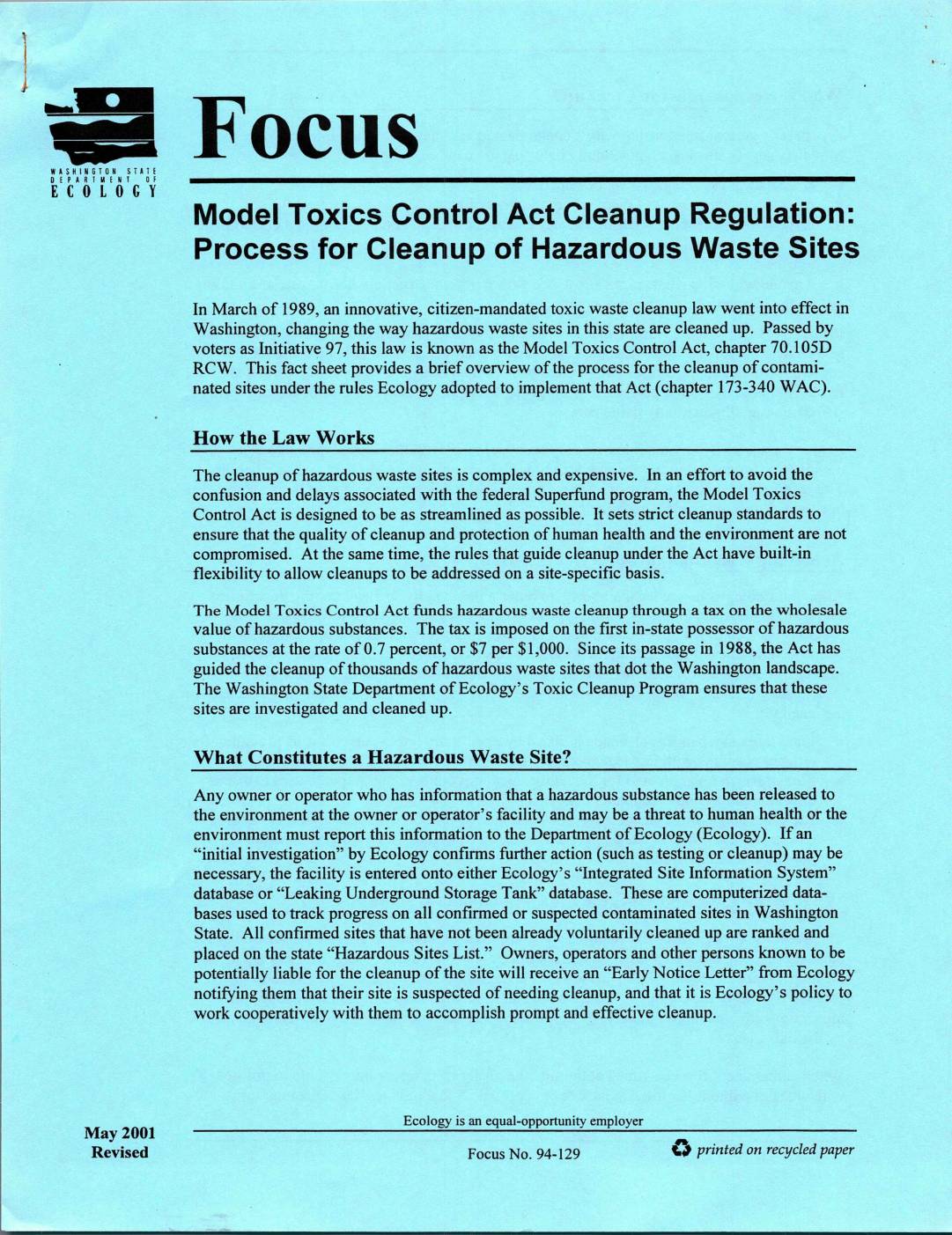 Ecology Focus Model Toxic Control Act Cleanup Regulation Process For Cleanup Of Hazardous Waste Sites May 2001 0001