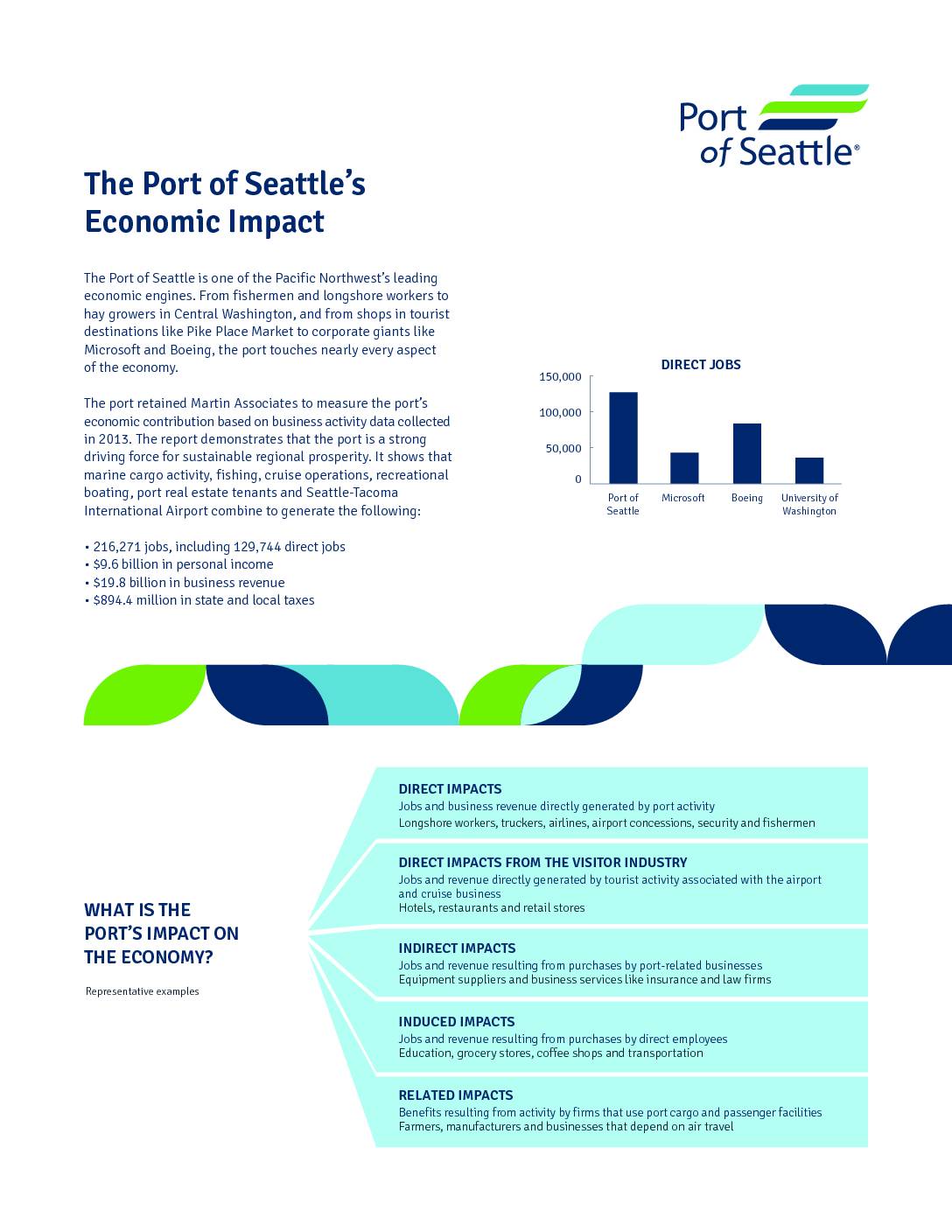 The Port of Seattle is one of the Pacific Northwest’s leading economic engines. From fishermen and longshore workers to hay growers in Central Washington, and from shops in tourist destinations like Pike Place Market to corporate giants like Microsoft and Boeing, the port touches nearly every aspect of the economy. The port retained Martin Associates to measure the port’s economic contribution based on business activity data collected in 2013. The report demonstrates that the port is a strong driving force for sustainable regional prosperity. It shows that marine cargo activity, fishing, cruise operations, recreational boating, port real estate tenants and Seattle-Tacoma International Airport combine to generate the following: • 216,271 jobs, including 129,744 direct jobs • $9.6 billion in personal income • $19.8 billion in business revenue • $894.4 million in state and local taxes 150,000 Port of Seattle Microsoft Boeing University of Washington 100,000 50,000 DIRECT JOBS DIRECT IMPACTS Jobs and business revenue directly generated by port activity Longshore workers, truckers, airlines, airport concessions, security and fishermen RELATED IMPACTS Benefits resulting from activity by firms that use port cargo and passenger facilities Farmers, manufacturers and businesses that depend on air travel DIRECT IMPACTS FROM THE VISITOR INDUSTRY Jobs and revenue directly generated by tourist activity associated with the airport and cruise business Hotels, restaurants and retail stores INDIRECT IMPACTS Jobs and revenue resulting from purchases by port-related businesses Equipment suppliers and business services like insurance and law firms INDUCED IMPACTS Jobs and revenue resulting from purchases by direct employees… -