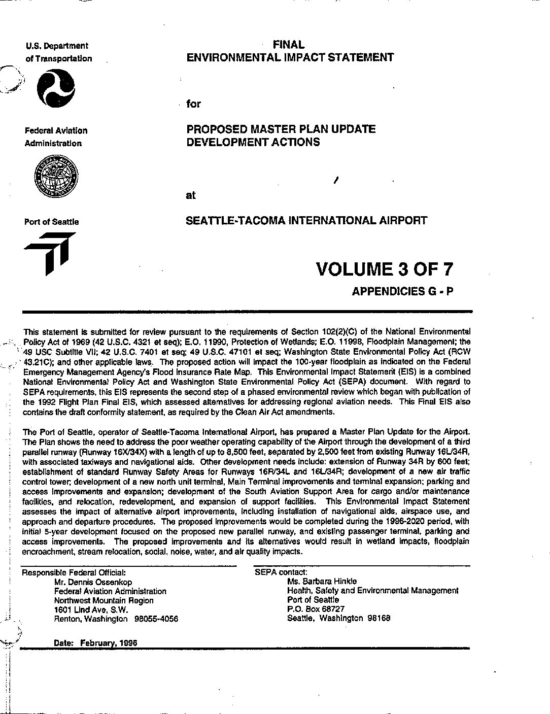 This statement is submitted for review pursuant to the requirements of Section 102(2)(C) of the National Environmental. Policy Act of 1969 (42 U.S.C. 4321 et seq); E.O. 11990, Protection of Wetlands; E.O. 11998, Floodplain Management; the - 49 USC Subtitle VII; 42 U.S.C. 7401 et seq; 49 U.S.C. 47101 et seq; Washington State Environmental Policy Act (RCW 43.21C); and other applicable laws. The proposed action will impact the 100-year floodplain as indicated on the Federal Emergency Management Agency's Flood Insurance Rate Map. This Environmental Impact Statement (EIS) is a combined National Environmental Policy Act and Washington State Environmental Policy Act (SEPA) document. With regard to SEPA requirements, this EIS represents the second step of a phased environmental review which began with publication of the 1992 Flight Plan Final EIS, which assessed alternatives for addressing regional aviation needs. This Final EIS also contains the draft conformity statement, as required by the Clean Air Act amendments. The Port of Seattle, operator of Seattle-Tacoma International Airport, has prepared a Master Plan Update for the Airport. The Plan shows the need to address the poor weather operating capability of the Airport through the development of a third parallel runway (Runway 16W34X) with a length of up to 8,500 feet, separated by 2,500 feet from existlng Runway 16L/34R, with associated taxiways and navigational aids. Other development needs include: extension of Runway 34R by 600 feet; establishment of standard Runway Safety Areas for Runways 16FU34L and 16U34R; development of a new air traffic control tower; development…