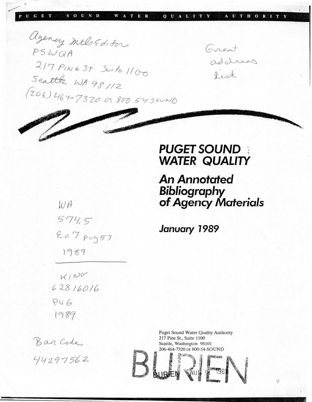 ;) :HG’-'73Za Cr, gaZ G–c/’ S o c/hJ{..) PUGH SOUND WATER QUALIW An Annotded MA rJ gen I aterials ; a c/, S-- January 1989 td I pu397 H' 1 lo(/ C1%. / LO/6 V)UG tqg7 Puget Sound Water Quality Authority 217 Pine St., Suite 1100 Seattle, Washington 98101 206-464-7320 or 800-54-SOUND IL/ III 562 :?! '1 HIgH ini••Hll•IH•H•iw=in –-Un-n=/ ling nonpoint source pollution, will be available in spring 1989. (available from PSWQA no cost) 3) Bibliography of educational materials for watershed planning. 1988. A preliminary compilation of materials (local and national) of interest to anyone involved with nonpoint source pollution and watershed planning. 17pp. (available from PSWQA no cost) E) Washington Department of Ecology Note: The Department publishes a series of ”FOCUS" fact sheets briefly discussing various nonpoint source pol- lution issues, available free from the Publications Office. 1) Local planning and management ofnonpoint source pollution (Chapter 4(n-12 WAC). 1988. This nonpoint Tule promulgated by the Puget Sound Water Quality Authority and coordinated by the Department of Ecology establishes ”criteria and procedures for ranking water- sheds and for developing and implementing action plans for watersheds most in need of corrective and/or preven- tive actions". 141>p. (available from Ecology, Water Quality Management Section, Nonpoint Source Unit, 206- 438-7069 or from the Puget Sound Water Quality Authority, no cost) 2) Nonpoint source pollution management program. Draft. 1988. This document describes the sources of fund- ing for nonpoint activities, state and regional programs for implementing best management practices and federal programs that…