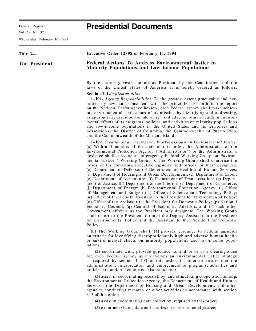 Executive Order 12898 of February 11, 1994 Federal Actions To Address Environmental Justice in Minority Populations and Low-Income Populations By the authority vested in me as President by the Constitution and the laws of the United States of America, it is hereby ordered as follows: Section 1–1.Implementation. 1–101. Agency Responsibilities. To the greatest extent practicable and per- mitted by law, and consistent with the principles set forth in the report on the National Performance Review, each Federal agency shall make achiev- ing environmental justice part of its mission by identifying and addressing, as appropriate, disproportionately high and adverse human health or environ- mental effects of its programs, policies, and activities on minority populations and low-income populations in the United States and its territories and possessions, the District of Columbia, the Commonwealth of Puerto Rico, and the Commonwealth of the Mariana Islands. 1–102. Creation of an Interagency Working Group on Environmental Justice. (a) Within 3 months of the date of this order, the Administrator of the Environmental Protection Agency (‘‘Administrator’’) or the Administrator’s designee shall convene an interagency Federal Working Group on Environ- mental Justice (‘‘Working Group’’). The Working Group shall comprise the heads of the following executive agencies and offices, or their designees: (a) Department of Defense; (b) Department of Health and Human Services; (c) Department of Housing and Urban Development; (d) Department of Labor; (e) Department of Agriculture; (f) Department of Transportation; (g) Depart- ment of Justice; (h) Department of the Interior; (i) Department of Commerce; (j) Department of…