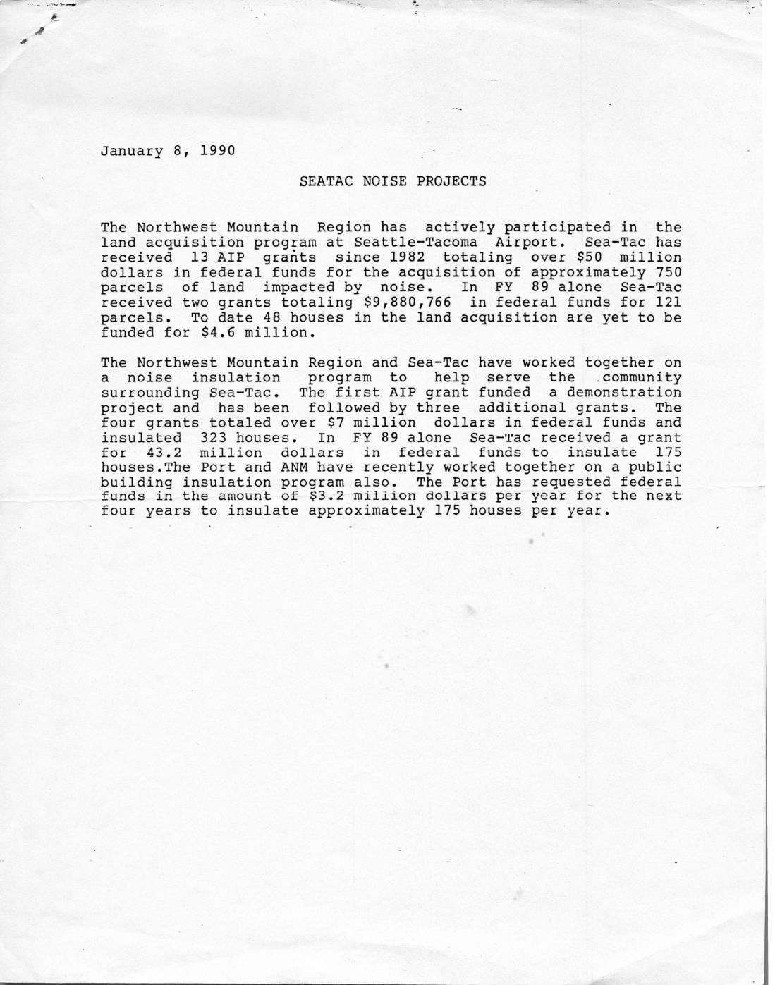 The Northwest Mountain Region has actively participated in the land acquisition program at Seattle-'Tacoma Airport+ Sea-Tac has received 13 AIP graits since 1982 totaling over $50 million dollars in federal fun c:Is for the acquisition of approximately 750 parcels of land impacted by noise . In FY 89 alone Sea'-’Tac received two grants totaling $9 ,880 ,766 in federal funds for 121 parcels , To date 48 houses in the land acquisition are yet to be funded for $4.6 million. The Northwest Mountain Region and Sea--Tac have worked together on a noise insulation program to help serve the . community surrounding Sea-Tac , The first AIP grant funded a demonstration project and has been followed by three additional grants . The four grants totaled over $7 million dollars in federal funds and insulated 323 houses , in FY 89 alone Sea'-"l'ac received a grant for 43 , 2 rni11ion dollars in fe<3eral funds to insulate 175 houses , The Port and ANM have recently worked together on a public building insulation program also . The Port has requested federal funds in the amount of §3 . 2 xlillion dollars per year for the next four years to insulate approximately 175 houses per year J