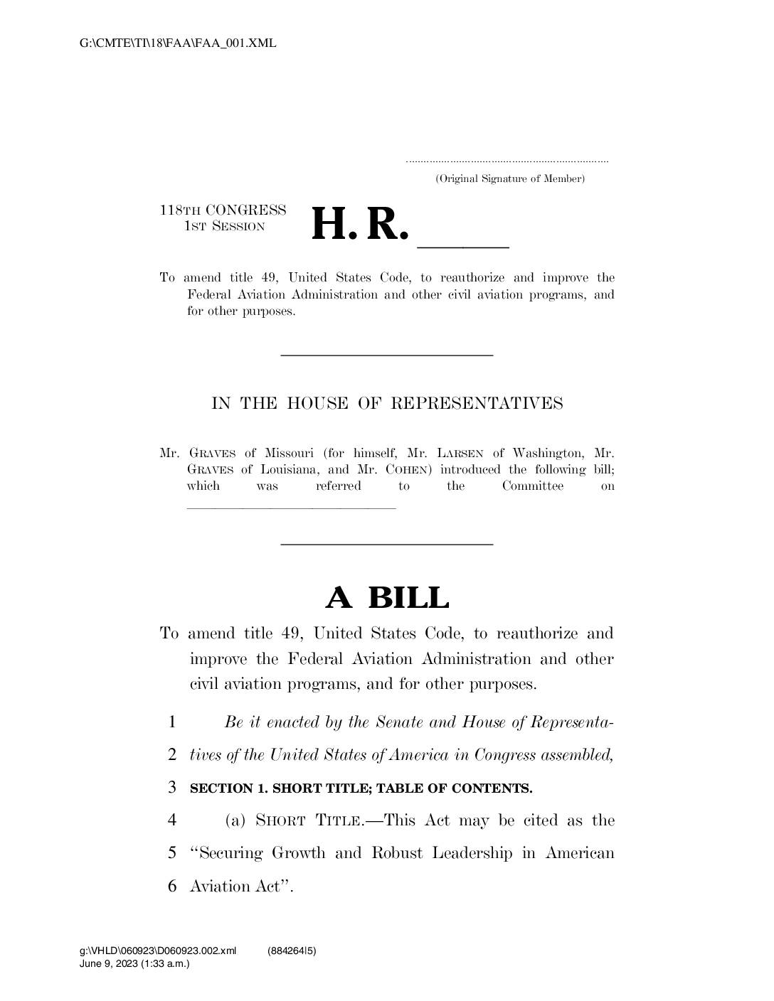 To amend title 49, United States Code, to reauthorize and improve the Federal Aviation Administration and other civil aviation programs, and for other purposes. IN THE HOUSE OF REPRESENTATIVES Mr. GRAVES of Missouri (for himself, Mr. LARSEN of Washington, Mr. GRAVES of Louisiana, and Mr. COHEN) introduced the following bill; which was referred to the Committee on lllllllllllllll A BILL To amend title 49, United States Code, to reauthorize and improve the Federal Aviation Administration and other civil aviation programs, and for other purposes. Be it enacted by the Senate and House of Representa-1 tives of the United States of America in Congress assembled, 2 SECTION 1. SHORT TITLE; TABLE OF CONTENTS. 3 (a) SHORT TITLE.—This Act may be cited as the 4 ‘‘Securing Growth and Robust Leadership in American 5 Aviation Act’’. 6 VerDate Nov 24 2008 01:33 Jun 09, 2023 Jkt 000000 PO 00000 Frm 00001 Fmt 6652 Sfmt 6201 C:USERSRJCASTUROAPPDATAROAMINGSOFTQUADXMETAL11.0GENCFAA_001 June 9, 2023 (1:33 a.m.) G:CMTETI18FAAFAA_001.XML g:VHLD60923D060923.002.xml (884264|5) (b) TABLE OF CONTENTS.—The table of contents for 1 this Act is as follows: 2 Sec. 1. Short title; table of contents. TITLE I—AUTHORIZATIONS AND FAA ORGANIZATIONAL REFORM Subtitle A—Authorizations Sec. 101. Airport planning and development and noise compatibility planning and programs. Sec. 102. Facilities and equipment. Sec. 103. Operations. Sec. 104. Extension of miscellaneous expiring authorities. Subtitle B—FAA Organizational Reform Sec. 121. FAA leadership. Sec. 122. FAA management board. Sec. 123. Prohibition on conflicting pecuniary interests. Sec. 124. Authority of Secretary and Administrator. Sec. 125. Review of FAA…