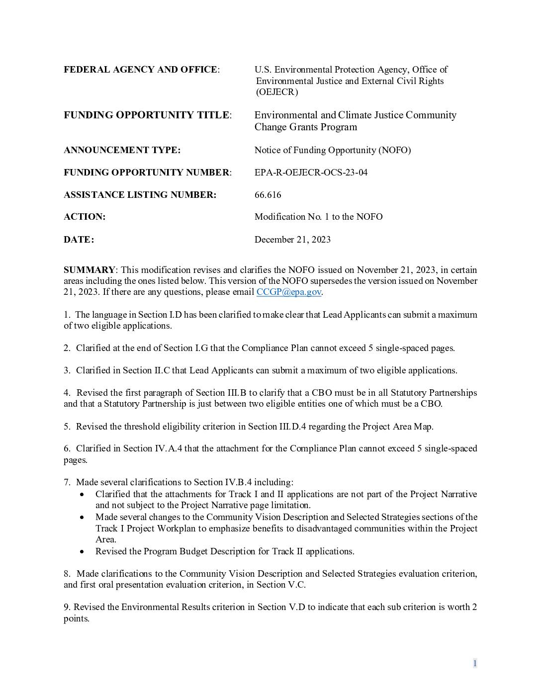 FEDERAL AGENCY AND OFFICE: U.S. Environmental Protection Agency, Office of Environmental Justice and External Civil Rights (OEJECR) FUNDING OPPORTUNITY TITLE: Environmental and Climate Justice Community Change Grants Program ANNOUNCEMENT TYPE: Notice of Funding Opportunity (NOFO) FUNDING OPPORTUNITY NUMBER: EPA-R-OEJECR-OCS-23-04 ASSISTANCE LISTING NUMBER: 66.616 ACTION: Modification No. 2 to the NOFO DATE: February 12, 2024 SUMMARY: This modification revises and clarifies the NOFO issued on November 21, 2023, and modified on December 21, 2023, in certain areas including the ones listed below. This version of the NOFO supersedes previous versions of the NOFO. If there are any questions, please email CCGP@epa.gov. 1. The Important Dates section on the first page of the NOFO was revised to indicate that anticipated initial selections are expected in April 2024 and the anticipated start of the period of performance for initial selections is June 2024. 2. Section I.E of the NOFO was modified to provide additional information on technical assistance including a link to information about technical assistance from EPA’s contractor. 3. Climate Action Strategy 6, Brownfields Redevelopment, in Section I.G of the NOFO was clarified to indicate that applications must demonstrate that cleanup is complete or not necessary at the time an application is submitted. Similar language was also clarified in Section III.D.8 of the NOFO and in Appendix C for Climate Action Strategy 6. 4. In Section II.B of the NOFO, language was clarified about Target Investment Areas A and B. 5. Clarified in Section IV.A.4 of the NOFO that Attachment C of…