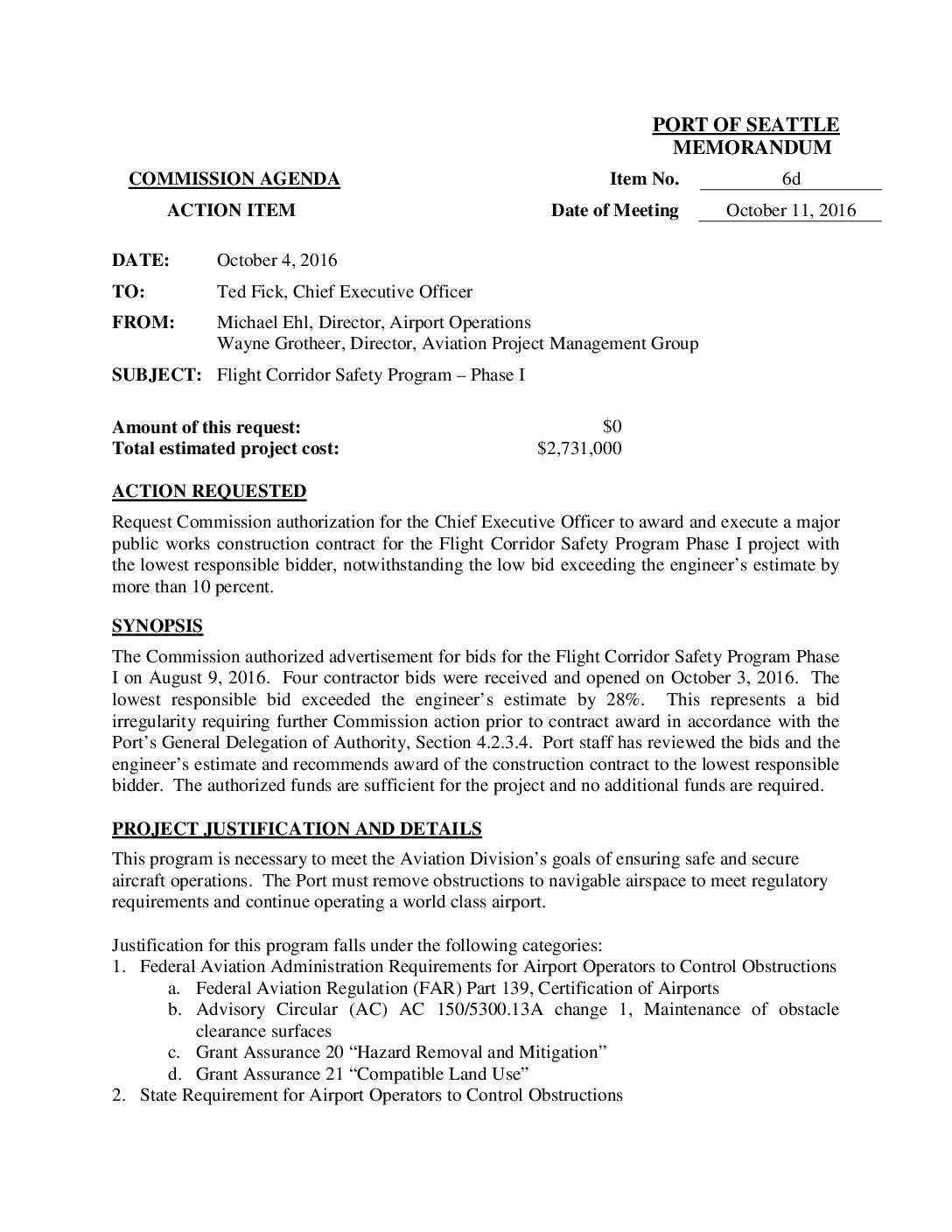 ACTION ITEM Date of Meeting October 11, 2016 DATE: October 4, 2016 TO: Ted Fick, Chief Executive Officer FROM: Michael Ehl, Director, Airport Operations Wayne Grotheer, Director, Aviation Project Management Group SUBJECT: Flight Corridor Safety Program – Phase I Amount of this request: $0 Total estimated project cost: $2,731,000 ACTION REQUESTED Request Commission authorization for the Chief Executive Officer to award and execute a major public works construction contract for the Flight Corridor Safety Program Phase I project with the lowest responsible bidder, notwithstanding the low bid exceeding the engineer’s estimate by more than 10 percent. SYNOPSIS The Commission authorized advertisement for bids for the Flight Corridor Safety Program Phase on August 9, 2016. Four contractor bids were received and opened on October 3, 2016. The lowest responsible bid exceeded the engineer’s estimate by 28%. This represents a bid irregularity requiring further Commission action prior to contract award in accordance with the Port’s General Delegation of Authority, Section 4.2.3.4. Port staff has reviewed the bids and the engineer’s estimate and recommends award of the construction contract to the lowest responsible bidder. The authorized funds are sufficient for the project and no additional funds are required. PROJECT JUSTIFICATION AND DETAILS This program is necessary to meet the Aviation Division’s goals of ensuring safe and secure aircraft operations. The Port must remove obstructions to navigable airspace to meet regulatory requirements and continue operating a world class airport. Justification for this program falls under the following categories: 1. Federal Aviation Administration Requirements for…