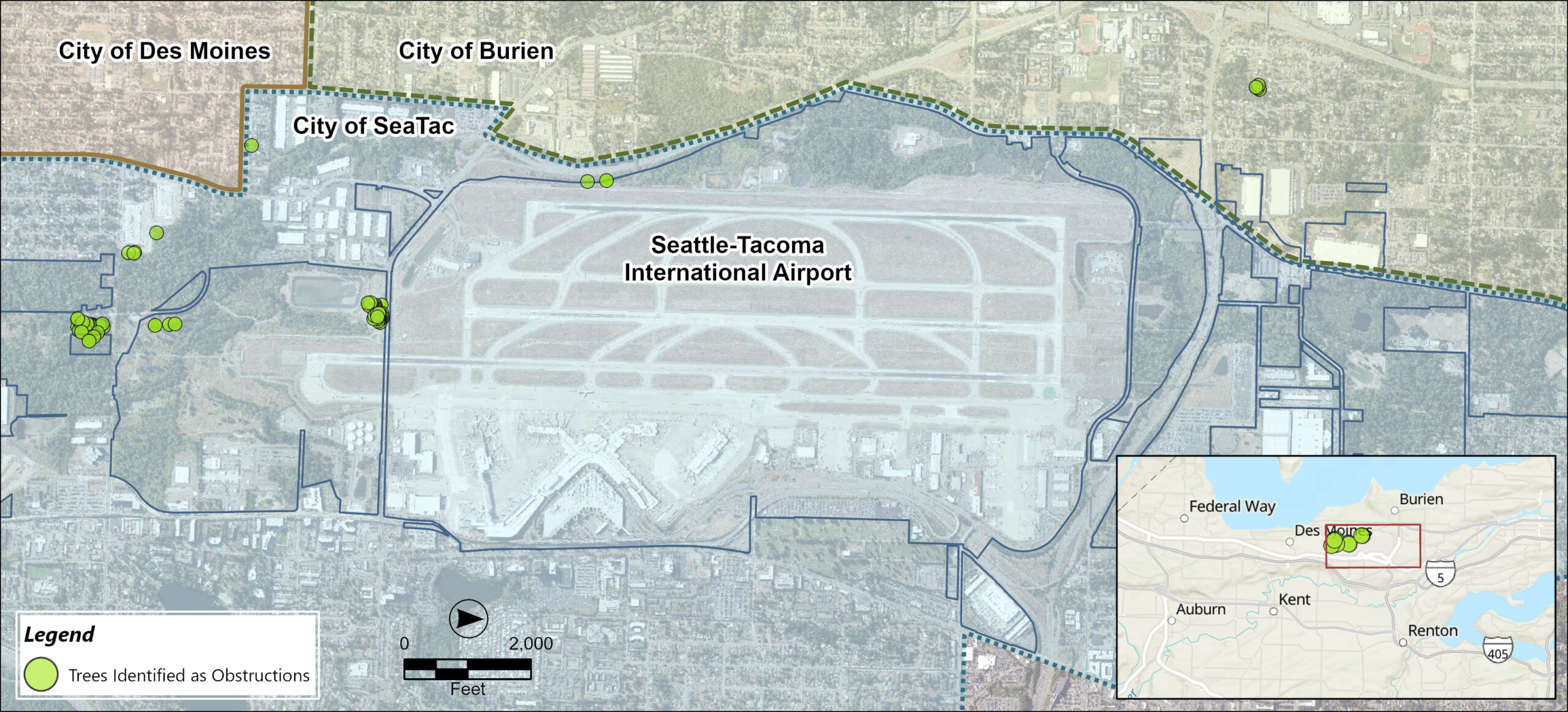 The Port of Seattle has an ongoing program to remove trees around SEA Airport to improve safety during takeoffs and landings and replant in their place, native, low-growing trees. The first phase of work, completed in 2019, centered around trees on Port property.  The second phase of the work, centered on non-Port property, is nearing