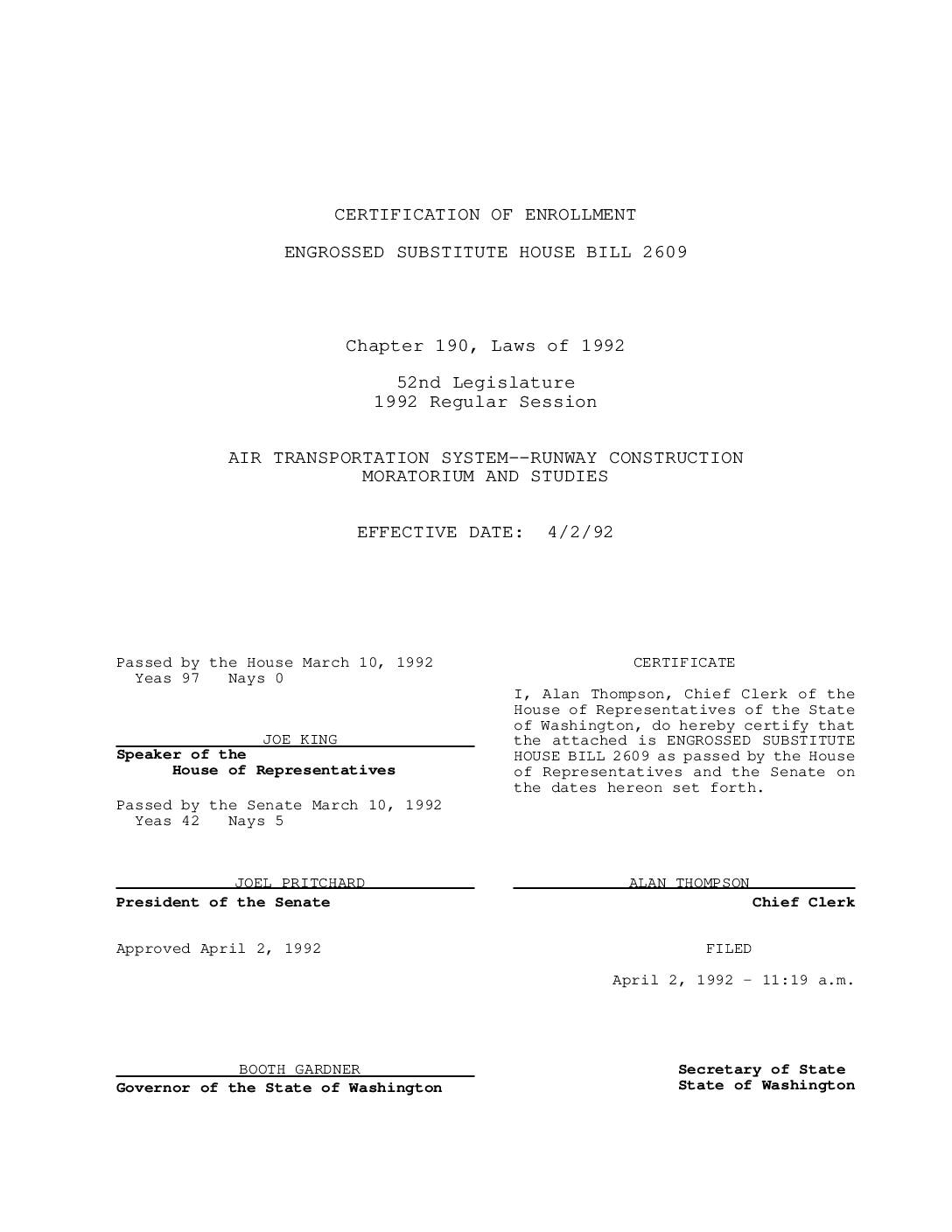 Passed by the House March 10, 1992 Yeas 97 Nays 0 JOE KING Speaker of the House of Representatives Passed by the Senate March 10, 1992 Yeas 42 Nays 5 CERTIFICATE I, Alan Thompson, Chief Clerk of the House of Representatives of the State of Washington, do hereby certify that the attached is ENGROSSED SUBSTITUTE HOUSE BILL 2609 as passed by the House of Representatives and the Senate on the dates hereon set forth. JOEL PRITCHARD President of the Senate ALAN THOMPSON Chief Clerk Approved April 2, 1992 FILED April 2, 1992 - 11:19 a.m. BOOTH GARDNER Governor of the State of Washington Secretary of State State of Washington _______________________________________________ ENGROSSED SUBSTITUTE HOUSE BILL 2609 _______________________________________________ AS AMENDED BY THE SENATE Passed Legislature - 1992 Regular Session State of Washington 52nd Legislature 1992 Regular Session By House Committee on Transportation (originally sponsored by Representatives Hine, G. Fisher, R. Fisher, Brough, Heavey, Locke, Chandler, Leonard, Valle, Wood, Prentice, Hochstatter, Mitchell, Horn, Rasmussen, Paris, R. King, Beck, Spanel, Nelson, Appelwick, Wilson, Franklin, Wang, Jacobsen and Belcher) Read first time 02/11/92. AN ACT Relating to air transportation; amending RCW 47.86.030;1 adding a new section to chapter 53.08 RCW; creating a new section; and2 declaring an emergency.3 BE IT ENACTED BY THE LEGISLATURE OF THE STATE OF WASHINGTON:4 NEW SECTION. Sec. 1. The legislature finds that an integrated5 air transportation system with efficient intermodal linkages is vital6 to the economic and social vitality of the state. Coordination and7 cooperation among public agencies and between…