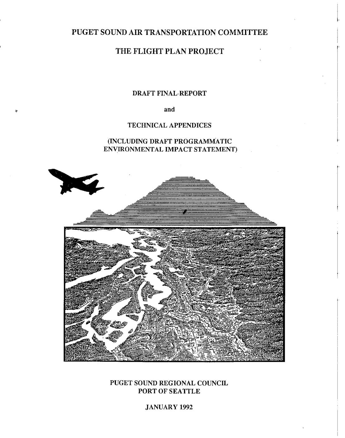 Flight Plan Project Draft Final Report and Technical Appendices (including Draft Programmatic Environmental Impact Statement) Flight Plan Study findings and draft recommendations for the long-term air carrier system needs of the Puget Sound Region DATE: January 1992 SOURCE OF COPIES: Puget Sound Regional Council Information Center 216 First Avenue South Seattle, WA 98104 (206) 464-7532 SPONSORSHIP: The Flight Plan Project was sponsored by the Puget Sound Regional Council and The Port of Seattle and by grants from the Federal Aviation Administration of the U.S. Department of Transportation. PUGET SOUND AIR TRANSPORTATION COMMITTEE PAUL BARDEN King County Council M. R. DINSMORE Port of Scnttle RAY DWSMORE Port of Olympia ROY PERGUSON State Representative DAVID FIELD Wderal Aviation Administration BERNARD FREDMAN Snal~omisli Connty Citizen WILLIAM HAMILTON State Dcparlment of Transportation FRANK HANSEN Mayor of SeaTac OWIN HICKS Thurston County Citizen RICHARD KENNEDY Dos Moincs City Council ROBERT LARSON Mayor of Slanwood IIARRY LEHR Alaska Airlincs DARLENE MADENWALD Wasltington Environmental Council - P & D Aviation Pararnctrix, hc. Mestre Greve & Associates CHAIRMAN ROBERT WALLACE Paciflc Group Properties Membershia Roster l!dsmt& Poter Beaulieu, Pmject Manager, Puget Sound Regional Com>cil Michael Feldman, PIoject Manager, Port of Seattic JOHN MCCARTHY Commissionar, Port of Tacoma LEMCLAUGHLIN Snohomish County Council JOHN MCNAMARA Air Transport Association PAlGE MILLER Comm!ssiancr, Port of Sealtlc RBNBB MONTGELAS Office of the Governor GREG MYKLAND Tacoma City Council u r NARODICK Representing King Caunty Business MART1N NEEB Pierce Caunty Ciliwn ROBERT NEIR Kirkland City Council GREG NICKELS King County Council ED NIELSON United… -