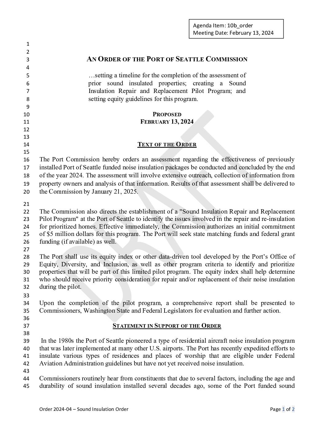 Order 2024-04 – Sound Insulation Order Page 1 of 2 AN ORDER OF THE PORT OF SEATTLE COMMISSION 3 …setting a timeline for the completion of the assessment of 5 prior sound insulated properties; creating a Sound 6 Insulation Repair and Replacement Pilot Program; and 7 setting equity guidelines for this program. 8 PROPOSED 10 FEBRUARY 13, 2024 11 TEXT OF THE ORDER 14 The Port Commission hereby orders an assessment regarding the effectiveness of previously 16 installed Port of Seattle funded noise insulation packages be conducted and concluded by the end 17 of the year 2024. The assessment will involve extensive outreach, collection of information from 18 property owners and analysis of that information. Results of that assessment shall be delivered to 19 the Commission by January 21, 2025. 20 The Commission also directs the establishment of a "Sound Insulation Repair and Replacement 22 Pilot Program" at the Port of Seattle to identify the issues involved in the repair and re-insulation 23 for prioritized homes. Effective immediately, the Commission authorizes an initial commitment 24 of $5 million dollars for this program. The Port will seek state matching funds and federal grant 25 funding (if available) as well. 26 The Port shall use its equity index or other data-driven tool developed by the Port’s Office of 28 Equity, Diversity, and Inclusion, as well as other program criteria to identify and prioritize 29 properties that will be part of this limited pilot program. The equity index shall help determine 30 who…