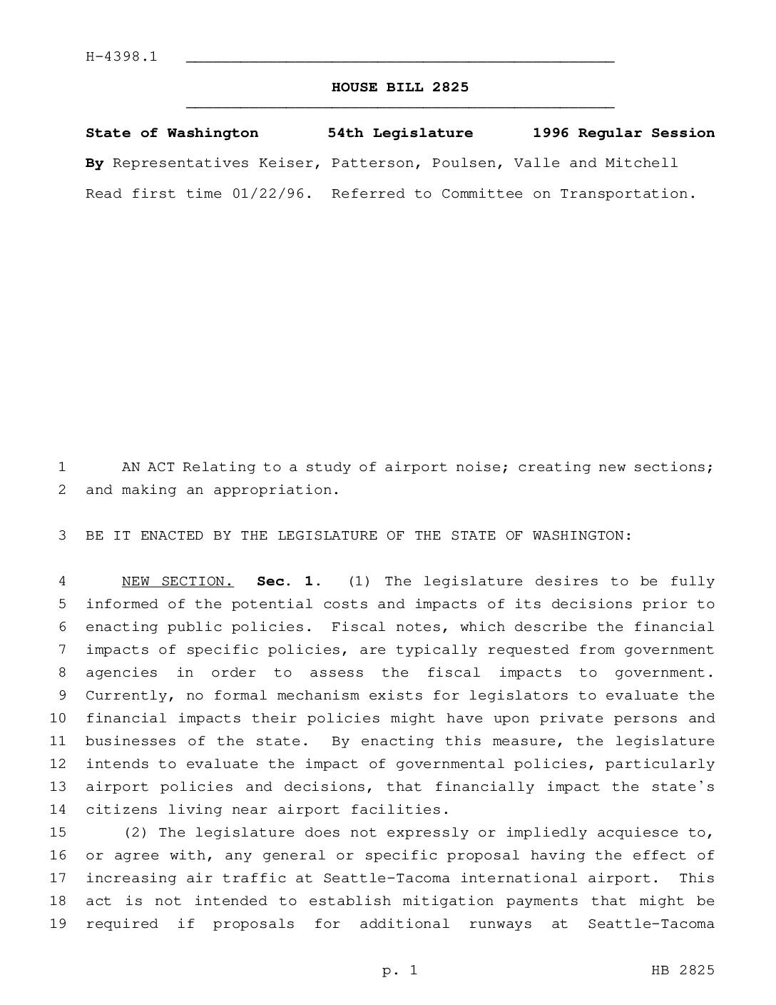 Washington State House Bill 2825 introduced in 1996 to conduct a study analyzing the impacts of airport noise and other factors on residential housing values near Seattle-Tacoma International Airport. The bill appropriates $75,000 for the legislative transportation committee to conduct the study and report results by December 15, 1996. Died in Transportation Committee and was