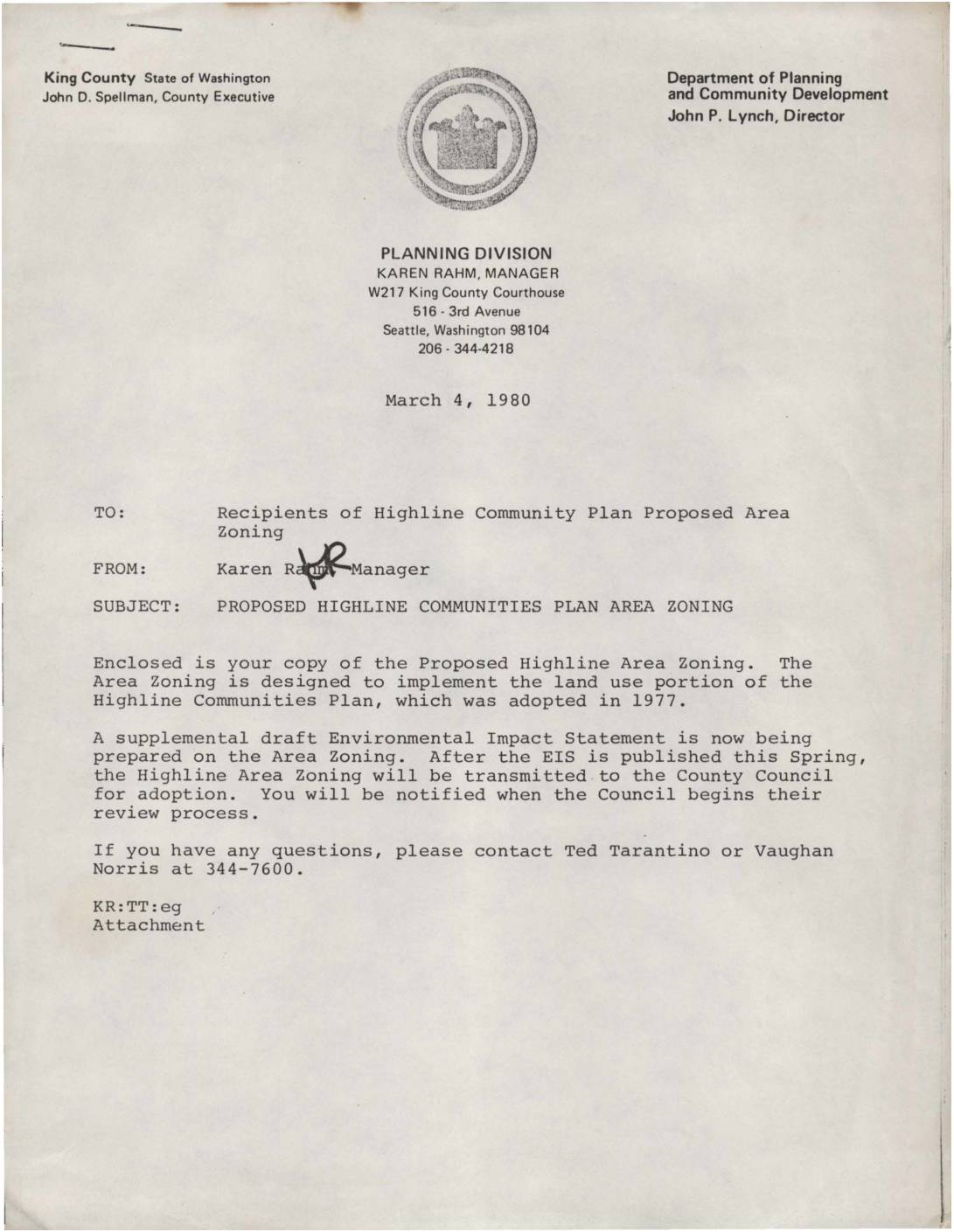 A memo from King County Planning Division regarding the proposed Highline Area Zoning designed to implement the land use portion of the Highline Communities Plan adopted in 1977. The memo announces preparation of a supplemental draft Environmental Impact Statement and future transmission to County Council for adoption.