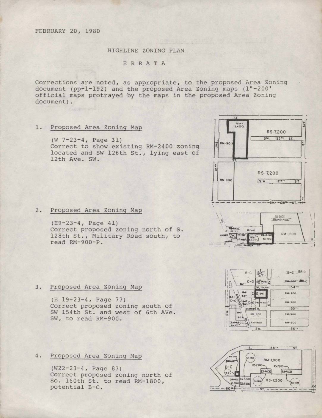 Corrections and errata for the Highline Zoning Plan, including amendments to proposed area zoning maps and documents. Contains specific zoning corrections for various locations including changes to RM-2400, RM-900-P, and other zoning designations.
