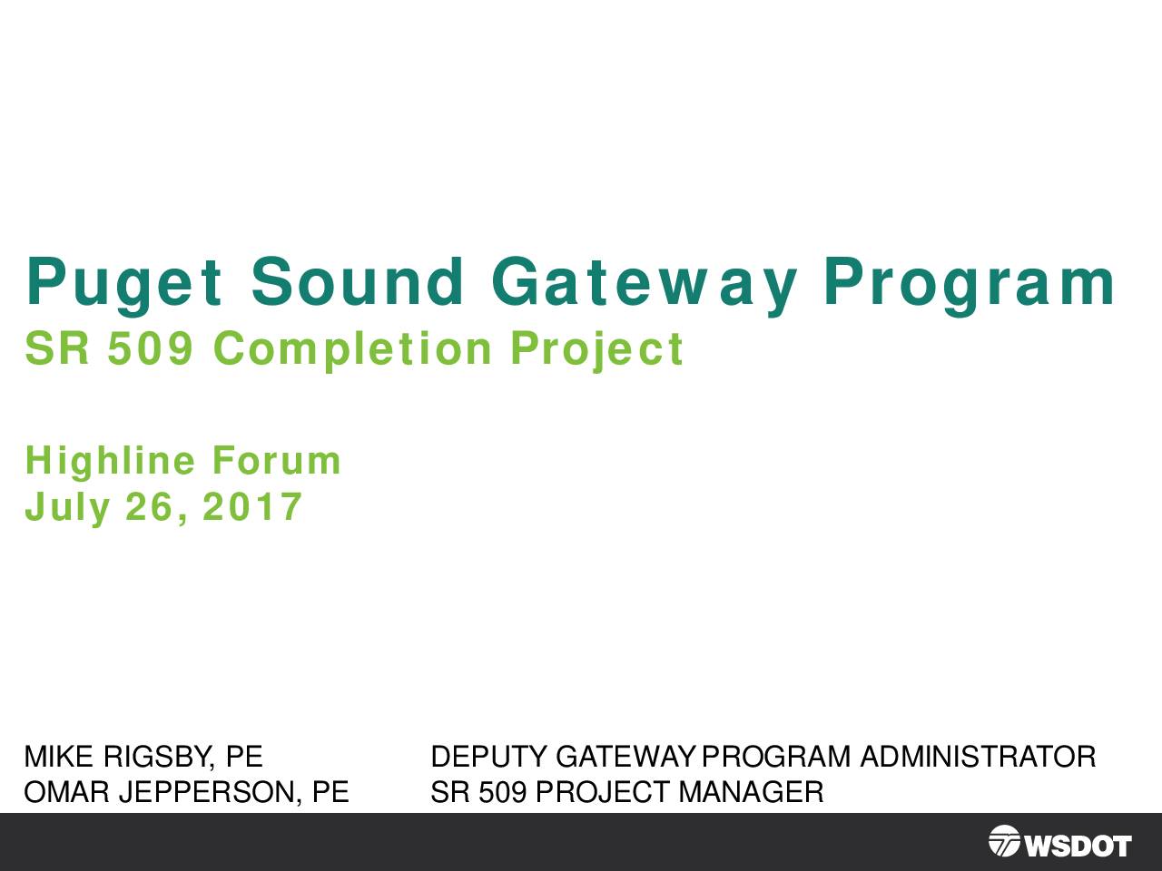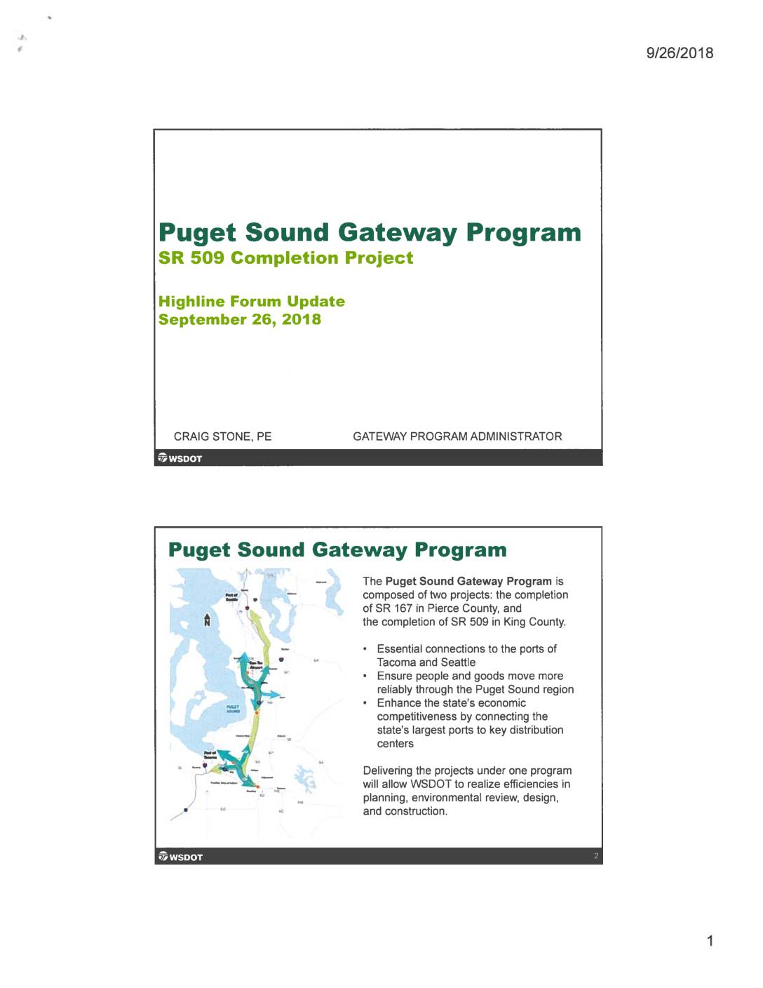 • Completing the Gateway Program provides more direct links from the state’s largest ports to the distribution centers in the region and to Eastern Washington • Provides direct access to Seattle-Tacoma International Airport from the south for both passenger and air cargo • Supports community and economic development Puget Sound Gateway Program - SR 509 & SR 167 Legislative Direction – 2015 ESHB 2524, Section 306 (23) In making budget allocations to the Puget Sound Gateway project, the department shall implement the project's construction as a single corridor investment. The department shall develop a coordinated corridor Construction and Implementation Plan for SR 167 and SR 509 in collaboration with affected stakeholders. Specific funding allocations must be based on where and when specific project segments are ready for construction to move forward and investments can be best optimized for timely project completion. Emphasis must be placed on avoiding gaps in fund expenditures for either project. Legislative Direction – 2017 Update ESB 5096, Section 306 (19) $93,500,000 of the Connecting Washington account is provided solely for the SR 167/SR 509 Puget Sound Gateway project. Any savings on the project must stay on the Puget Sound gateway corridor until the project is complete. Puget Sound Gateway Funding as enacted by the 2015 Legislature Puget Sound Gateway Funding as enacted by the 2017 Legislature $20m Legislative Direction – 2017 Update ESB 5096, Section 306 (20)(b) & (c) b) The secretary of transportation must develop a memorandum of understanding with local project stakeholders that identifies… -