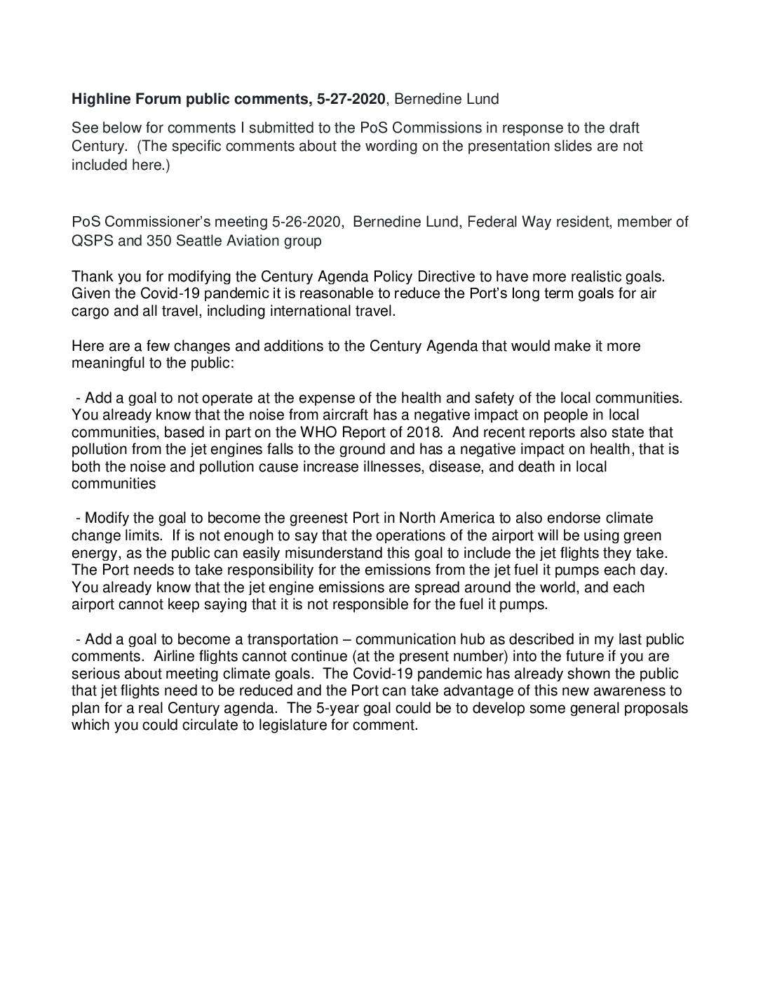 Highline Forum public comments, 5-27-2020, Bernedine Lund See below for comments I submitted to the PoS Commissions in response to the draft Century. (The specific comments about the wording on the presentation slides are not included here.) PoS Commissioner’s meeting 5-26-2020, Bernedine Lund, Federal Way resident, member of QSPS and 350 Seattle Aviation group Thank you for modifying the Century Agenda Policy Directive to have more realistic goals. Given the Covid-19 pandemic it is reasonable to reduce the Port’s long term goals for air cargo and all travel, including international travel. Here are a few changes and additions to the Century Agenda that would make it more meaningful to the public: - Add a goal to not operate at the expense of the health and safety of the local communities. You already know that the noise from aircraft has a negative impact on people in local communities, based in part on the WHO Report of 2018. And recent reports also state that pollution from the jet engines falls to the ground and has a negative impact on health, that is both the noise and pollution cause increase illnesses, disease, and death in local communities - Modify the goal to become the greenest Port in North America to also endorse climate change limits. If is not enough to say that the operations of the airport will be using green energy, as the public can easily misunderstand this goal to include the jet flights they take. The Port needs to take responsibility… -