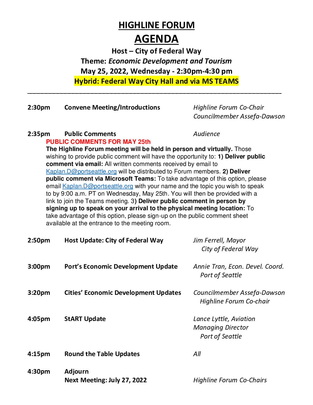 May 25, 2022, Wednesday - 2:30pm-4:30 pm Hybrid: Federal Way City Hall and via MS TEAMS __________________________________________________________________ 2:30pm Convene Meeting/Introductions Highline Forum Co-Chair Councilmember Assefa-Dawson 2:35pm Public Comments Audience PUBLIC COMMENTS FOR MAY 25th The Highline Forum meeting will be held in person and virtually. Those wishing to provide public comment will have the opportunity to: 1) Deliver public comment via email: All written comments received by email to Kaplan.D@portseattle.org will be distributed to Forum members. 2) Deliver public comment via Microsoft Teams: To take advantage of this option, please email Kaplan.D@portseattle.org with your name and the topic you wish to speak to by 9:00 a.m. PT on Wednesday, May 25th. You will then be provided with a link to join the Teams meeting. 3) Deliver public comment in person by signing up to speak on your arrival to the physical meeting location: To take advantage of this option, please sign-up on the public comment sheet available at the entrance to the meeting room. 2:50pm Host Update: City of Federal Way Jim Ferrell, Mayor City of Federal Way 3:00pm Port’s Economic Development Update Annie Tran, Econ. Devel. Coord. Port of Seattle 3:20pm Cities’ Economic Development Updates Councilmember Assefa-Dawson Highline Forum Co-chair 4:05pm StART Update Lance Lyttle, Aviation Managing Director Port of Seattle 4:15pm Round the Table Updates All 4:30pm Adjourn Next Meeting: July 27, 2022 Highline Forum Co-Chairs mailto:Kaplan.D@portseattle.org mailto:Kaplan.D@portseattle.org Highline Forum 2022 Meeting Dates
