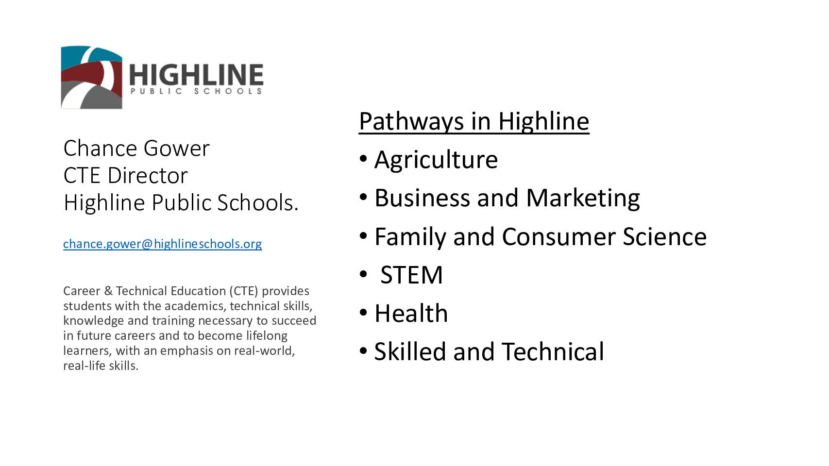 in future careers and to become lifelong learners, with an emphasis on real-world, real-life skills. mailto:chance.gower@highlineschools.org Highline CTE Data • 92 courses • 18 Schools (8 Middle Schools and 11 High Schools) • 916 (21-22) Middle School Students 7-8 • 4,850 (21-22) High School Students 9-12 • 51 courses have Dual Credit Opportunity (College Credit) and Industry Recognized Certifications (Microsoft, OSHA-10, ASE, Adobe, forklift etc..) • College Credits • 25 - Green River ; 42 - Highline; 65 - Renton Technical College https://www.highlineschools.org/academic-programs/career-technical-education Graduation Pathway’s EVERY STUDENT in Highline Public Schools is known by name, strength and need, and graduates prepared for the future they choose. • 4 year University /College • 2 year College • Apprenticeships / Internships • Military • Direct Employment Students can now graduate on a CTE Pathway! https://www.k12.wa.us/student-success/graduation/graduation-requirements/graduation-pathways -