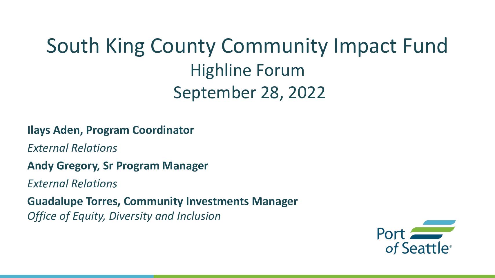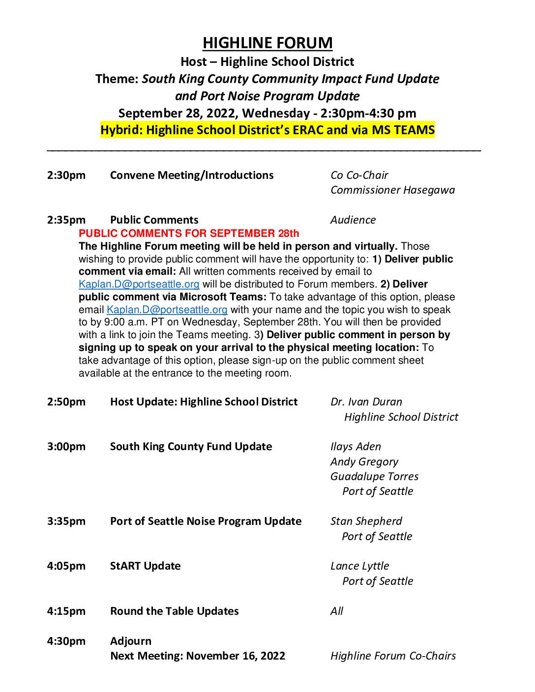 Theme: South King County Community Impact Fund Update and Port Noise Program Update September 28, 2022, Wednesday - 2:30pm-4:30 pm Hybrid: Highline School District’s ERAC and via MS TEAMS __________________________________________________________________ 2:30pm Convene Meeting/Introductions Co Co-Chair Commissioner Hasegawa 2:35pm Public Comments Audience PUBLIC COMMENTS FOR SEPTEMBER 28th The Highline Forum meeting will be held in person and virtually. Those wishing to provide public comment will have the opportunity to: 1) Deliver public comment via email: All written comments received by email to Kaplan.D@portseattle.org will be distributed to Forum members. 2) Deliver public comment via Microsoft Teams: To take advantage of this option, please email Kaplan.D@portseattle.org with your name and the topic you wish to speak to by 9:00 a.m. PT on Wednesday, September 28th. You will then be provided with a link to join the Teams meeting. 3) Deliver public comment in person by signing up to speak on your arrival to the physical meeting location: To take advantage of this option, please sign-up on the public comment sheet available at the entrance to the meeting room. 2:50pm Host Update: Highline School District Dr. Ivan Duran Highline School District 3:00pm South King County Fund Update Ilays Aden Andy Gregory Guadalupe Torres Port of Seattle 3:35pm Port of Seattle Noise Program Update Stan Shepherd Port of Seattle 4:05pm StART Update Lance Lyttle Port of Seattle 4:15pm Round the Table Updates All 4:30pm Adjourn Next Meeting: November 16, 2022 Highline Forum Co-Chairs mailto:Kaplan.D@portseattle.org mailto:Kaplan.D@portseattle.org Highline Forum 2022 Meeting Dates -