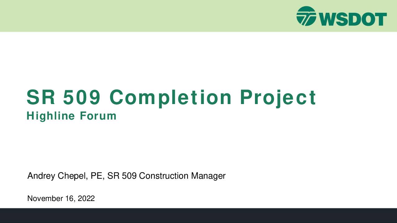 Andrey Chepel, PE, SR 509 Construction Manager November 16, 2022 SR 509 Completion Project Highline Forum • Project overview and timeline • Construction Progress – Stage 1a – Stage 1b • Stage 2 Procurement timeline • Community Engagement Agenda Puget Sound Gateway Program The Puget Sound Gateway Program is composed of two projects: the SR 167 Completion Project in Pierce County, and the SR 509 Completion Project in King County. • Essential connections to the ports of Tacoma and Seattle • Ensure people and goods move more reliably through the Puget Sound region • Enhance the state's economic competitiveness by connecting the state's largest ports to key distribution centers Delivering the projects under one program allows WSDOT to realize efficiencies in planning, environmental review, design, and construction. SR 509 Completion Project • SR 509 – Stage 1a (work performed by Sound Transit in FWLE) Open to traffic • SR 509 – Stage 1b I-5 to 24th Avenue South New Expressway Open to traffic in 2025 • SR 509 – Stage 2 24th Avenue South to South 188th Street New Expressway Open to traffic by 2029 Under construction Under construction Stage 1a • Construction activities in SeaTac • SR 99 bridge open to traffic Aug. 1, 2022 SR 99 Bridge (Sound Transit) Nov 3, 2022 • ST/WSDOT joint noise walls are complete along I-5 • 4,539 feet from S 216th Street to I-5/SR 516 interchange Noise Walls (Sound Transit) Aug 24, 2022 • Administered by King County Parks • WSDOT/Gateway contributed…