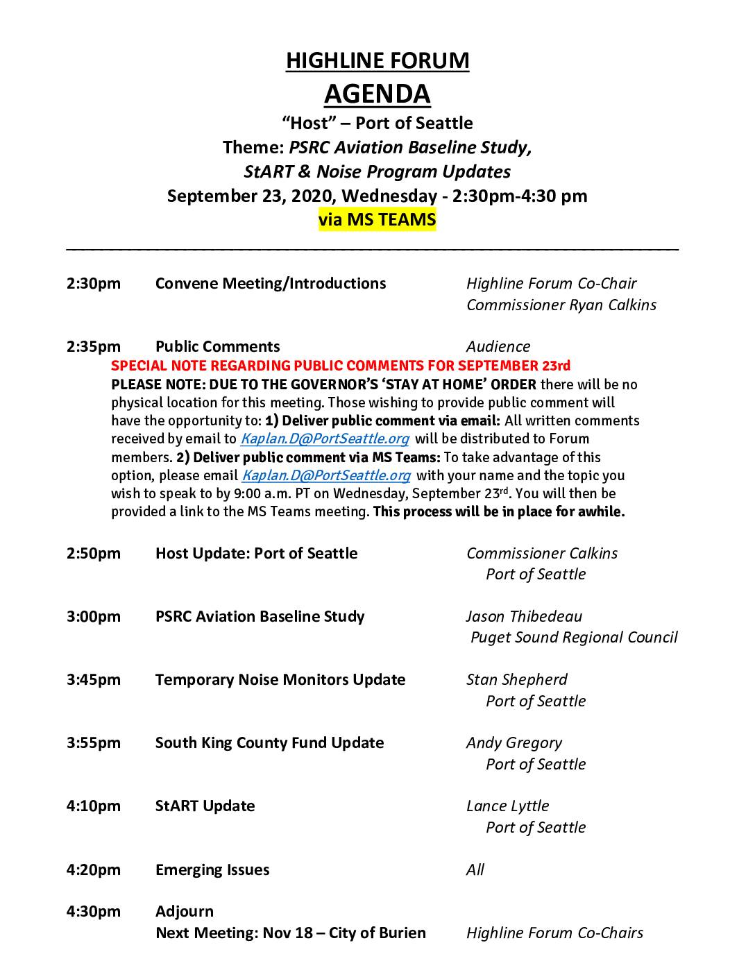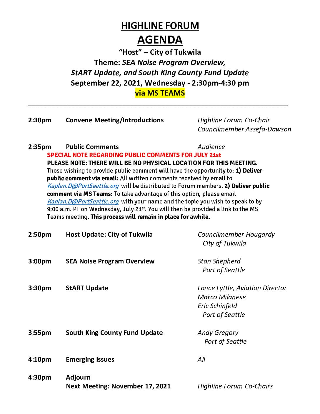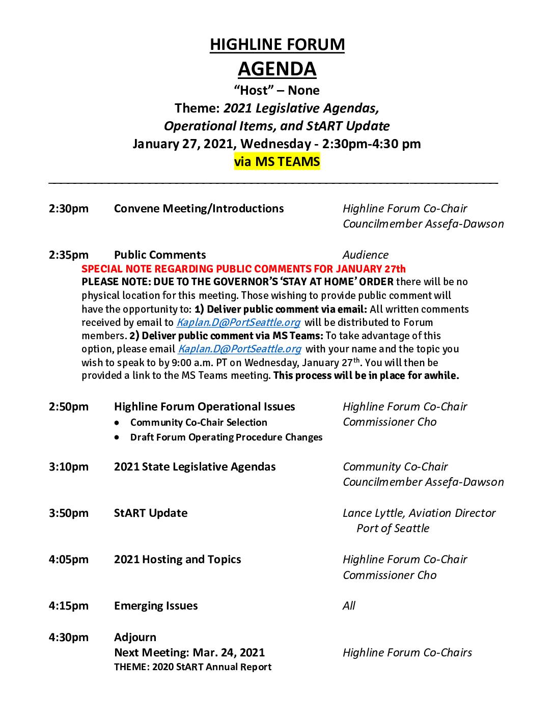 January 27, 2021, Wednesday - 2:30pm-4:30 pm via MS TEAMS __________________________________________________________________ 2:30pm Convene Meeting/Introductions Highline Forum Co-Chair Councilmember Assefa-Dawson 2:35pm Public Comments Audience SPECIAL NOTE REGARDING PUBLIC COMMENTS FOR JANUARY 27th PLEASE NOTE: DUE TO THE GOVERNOR’S ‘STAY AT HOME’ ORDER there will be no physical location for this meeting. Those wishing to provide public comment will have the opportunity to: 1) Deliver public comment via email: All written comments received by email to Kaplan.D@PortSeattle.org will be distributed to Forum members. 2) Deliver public comment via MS Teams: To take advantage of this option, please email Kaplan.D@PortSeattle.org with your name and the topic you wish to speak to by 9:00 a.m. PT on Wednesday, January 27th. You will then be provided a link to the MS Teams meeting. This process will be in place for awhile. 2:50pm Highline Forum Operational Issues Highline Forum Co-Chair • Community Co-Chair Selection Commissioner Cho • Draft Forum Operating Procedure Changes 3:10pm 2021 State Legislative Agendas Community Co-Chair Councilmember Assefa-Dawson 3:50pm StART Update Lance Lyttle, Aviation Director Port of Seattle 4:05pm 2021 Hosting and Topics Highline Forum Co-Chair Commissioner Cho 4:15pm Emerging Issues All 4:30pm Adjourn Next Meeting: Mar. 24, 2021 Highline Forum Co-Chairs THEME: 2020 StART Annual Report mailto:Kaplan.D@PortSeattle.org mailto:Kaplan.D@PortSeattle.org Highline Forum 2021 Meeting Dates Wednesday, January 27, 2021, 2:30pm to 4:30pm HOST: None Wednesday, March 24, 2021, 2:30pm to 4:30pm HOST: Wednesday, May 26, 2021, 2:30pm to 4:30pm HOST: Wednesday, July 21, 2021, 2:30pm to 4:30pm HOST: Wednesday, September 22, 2021, 2:30pm to… -