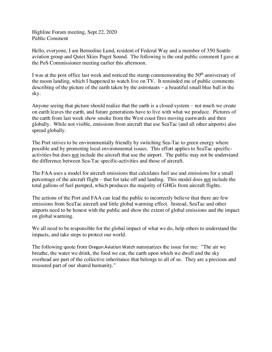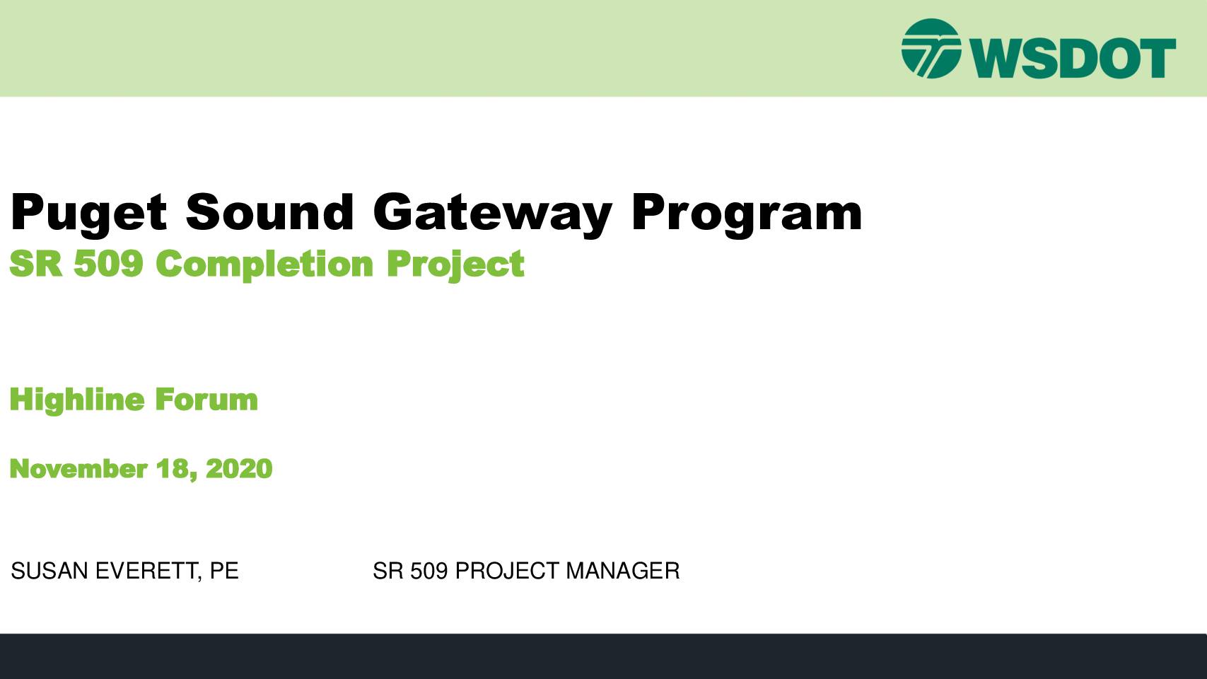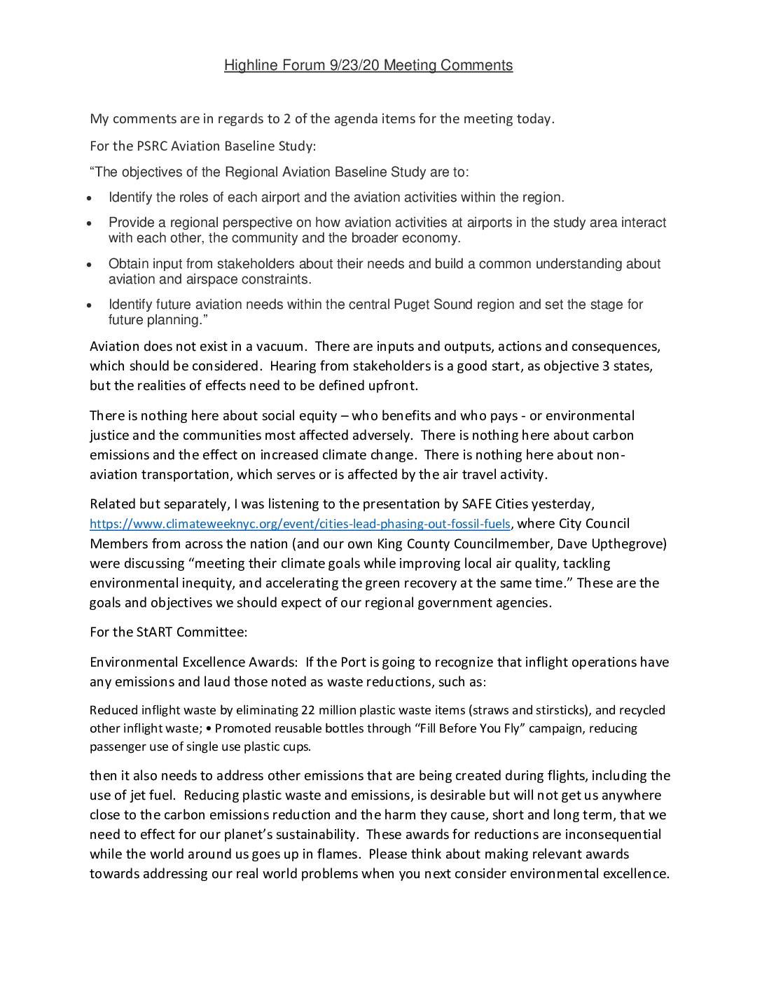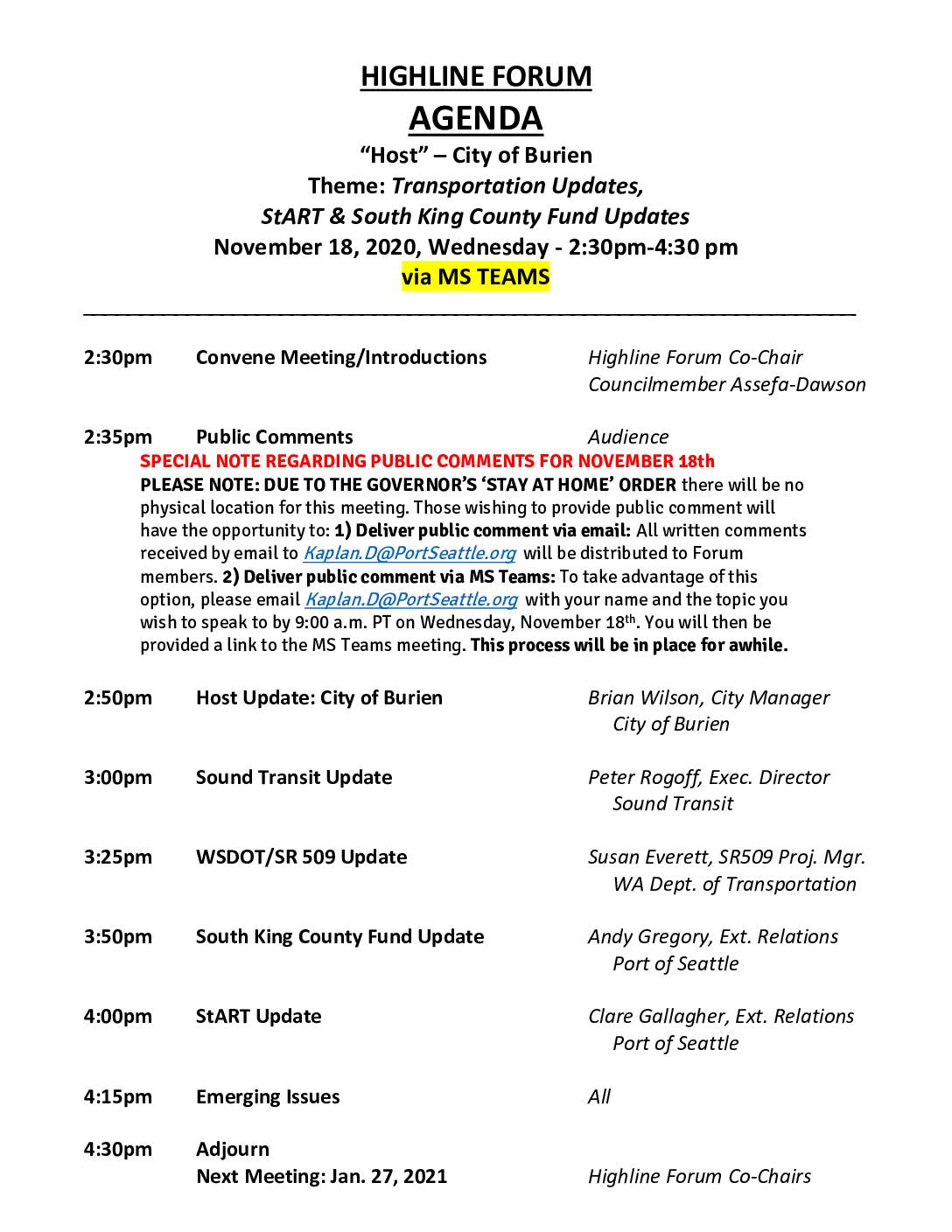 StART & South King County Fund Updates November 18, 2020, Wednesday - 2:30pm-4:30 pm via MS TEAMS __________________________________________________________________ 2:30pm Convene Meeting/Introductions Highline Forum Co-Chair Councilmember Assefa-Dawson 2:35pm Public Comments Audience SPECIAL NOTE REGARDING PUBLIC COMMENTS FOR NOVEMBER 18th PLEASE NOTE: DUE TO THE GOVERNOR’S ‘STAY AT HOME’ ORDER there will be no physical location for this meeting. Those wishing to provide public comment will have the opportunity to: 1) Deliver public comment via email: All written comments received by email to Kaplan.D@PortSeattle.org will be distributed to Forum members. 2) Deliver public comment via MS Teams: To take advantage of this option, please email Kaplan.D@PortSeattle.org with your name and the topic you wish to speak to by 9:00 a.m. PT on Wednesday, November 18th. You will then be provided a link to the MS Teams meeting. This process will be in place for awhile. 2:50pm Host Update: City of Burien Brian Wilson, City Manager City of Burien 3:00pm Sound Transit Update Peter Rogoff, Exec. Director Sound Transit 3:25pm WSDOT/SR 509 Update Susan Everett, SR509 Proj. Mgr. WA Dept. of Transportation 3:50pm South King County Fund Update Andy Gregory, Ext. Relations Port of Seattle 4:00pm StART Update Clare Gallagher, Ext. Relations Port of Seattle 4:15pm Emerging Issues All 4:30pm Adjourn Next Meeting: Jan. 27, 2021 Highline Forum Co-Chairs mailto:Kaplan.D@PortSeattle.org mailto:Kaplan.D@PortSeattle.org Highline Forum 2021 Meeting Dates Wednesday, January 27, 2021, 2:30pm to 4:30pm Wednesday, March 24, 2021, 2:30pm to 4:30pm Wednesday, May 26, 2021, 2:30pm to 4:30pm Wednesday, July 21, 2021, 2:30pm to… -