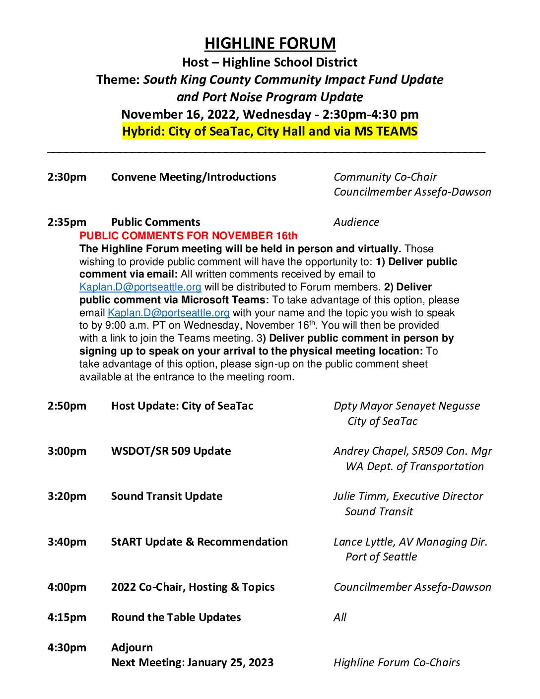 Theme: South King County Community Impact Fund Update and Port Noise Program Update November 16, 2022, Wednesday - 2:30pm-4:30 pm Hybrid: City of SeaTac, City Hall and via MS TEAMS __________________________________________________________________ 2:30pm Convene Meeting/Introductions Community Co-Chair Councilmember Assefa-Dawson 2:35pm Public Comments Audience PUBLIC COMMENTS FOR NOVEMBER 16th The Highline Forum meeting will be held in person and virtually. Those wishing to provide public comment will have the opportunity to: 1) Deliver public comment via email: All written comments received by email to Kaplan.D@portseattle.org will be distributed to Forum members. 2) Deliver public comment via Microsoft Teams: To take advantage of this option, please email Kaplan.D@portseattle.org with your name and the topic you wish to speak to by 9:00 a.m. PT on Wednesday, November 16th. You will then be provided with a link to join the Teams meeting. 3) Deliver public comment in person by signing up to speak on your arrival to the physical meeting location: To take advantage of this option, please sign-up on the public comment sheet available at the entrance to the meeting room. 2:50pm Host Update: City of SeaTac Dpty Mayor Senayet Negusse City of SeaTac 3:00pm WSDOT/SR 509 Update Andrey Chapel, SR509 Con. Mgr WA Dept. of Transportation 3:20pm Sound Transit Update Julie Timm, Executive Director Sound Transit 3:40pm StART Update & Recommendation Lance Lyttle, AV Managing Dir. Port of Seattle 4:00pm 2022 Co-Chair, Hosting & Topics Councilmember Assefa-Dawson 4:15pm Round the Table Updates All 4:30pm Adjourn Next Meeting: January 25, 2023 Highline Forum Co-Chairs… -