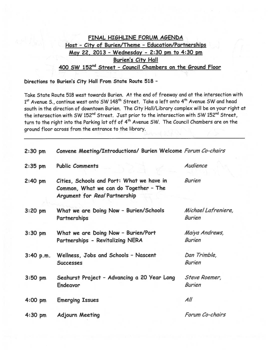 • Highline Forum – Agenda, May 22, 2013