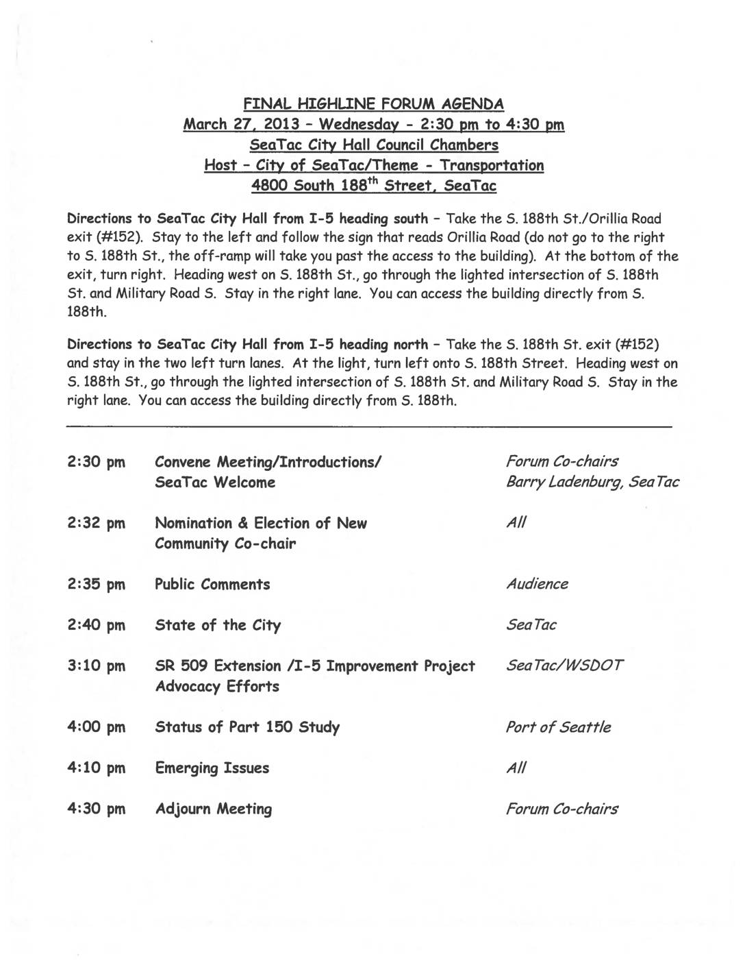 • Highline Forum – Agenda and Presentations, March 27, 2013