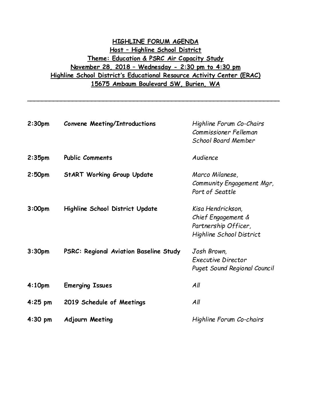Theme: Education & PSRC Air Capacity Study November 28, 2018 – Wednesday - 2:30 pm to 4:30 pm Highline School District’s Educational Resource Activity Center (ERAC) 15675 Ambaum Boulevard SW, Burien, WA __________________________________________________________________ -