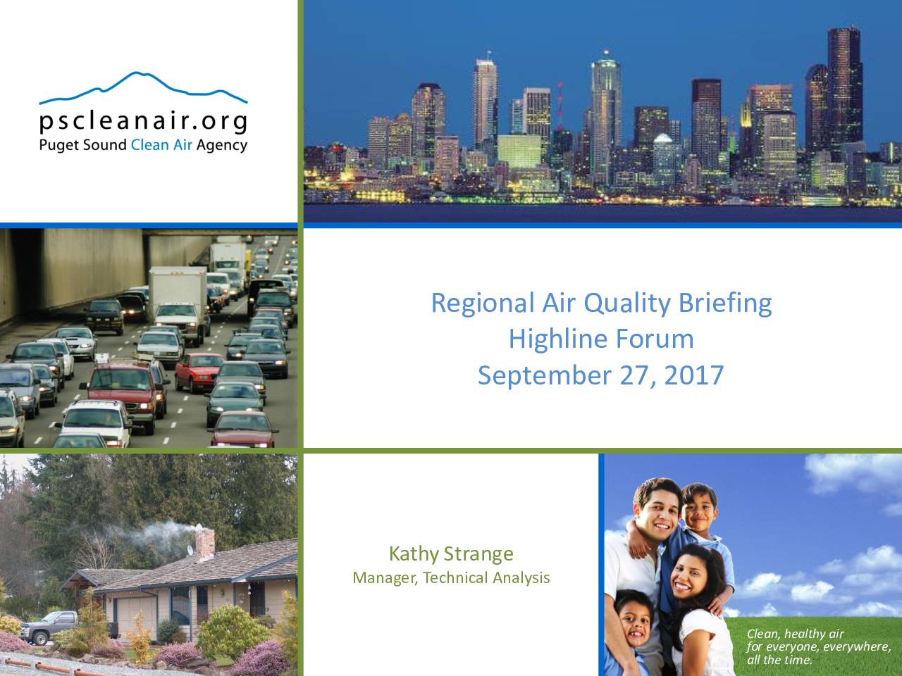 • Which air pollutants and communities do we focus on, and why? • Where do priority air pollutants come from? • How does air quality in south King County compare with other areas? What are trends? • What’s being done to improve air quality? • Ultrafine particle pollution and & upcoming University of Washington study • Questions? Agency Vision • All the people and natural systems in our region benefit from clean and healthy air all the time, regardless of socio-economic status or geographic location. • Our region does its part, and more, to protect the climate. Everyone has the right to breathe clean air. Small size; Cardiac and Respiratory Effects Fine Particle Pollution Why focus on fine particle pollution (PM2.5) Most established health effects include: • Asthma aggravation • Reduced lung function • Heart attacks • Strokes • Premature death Well established – based on large body of evidence National Ambient Air Quality Standard (acute and chronic); local health goal Variety of health effects Where does PM2.5 come from? Where does PM2.5 come from? Residential wood smoke, 30% Outdoor burning, 20% Cars and trucks,20% Commercial/ Industrial, 15% Ships, trains, airplanes, etc. 8% Construction, 7% Sources of Fine Particles in King County total % (2014 EPA NEI) Where does PM2.5 come from? EPA 2014 National Emissions Inventory 100 200 300 400 500 600 700 Diesel Heavy Duty Vehicles Gasoline Light Duty Vehicles Aircraft Diesel Light Duty Vehicles Gasoline Heavy Duty Vehicles Fi n e p ar ti cl e s… -