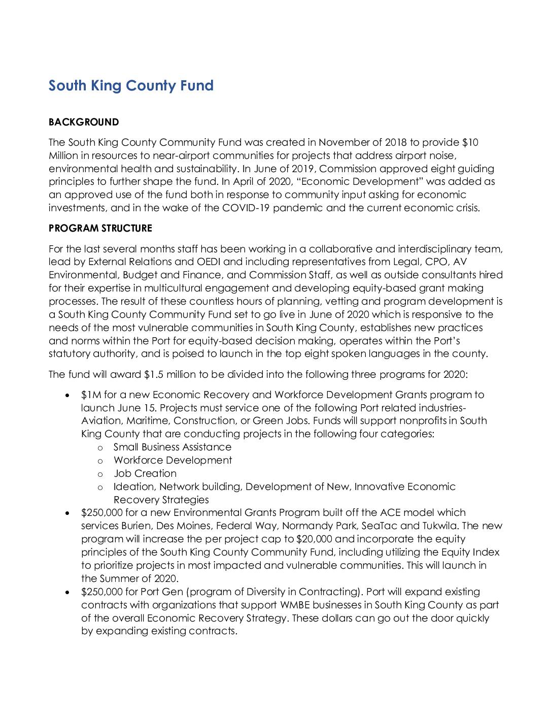 • In November 2018, Port Commission allocated $10 Million to be set aside for the near-airport communities for the five years between 2019-2023. • For illustrative purposes, the fund uses were to include “support for addressing airport noise and for other projects that support increased environmental health and sustainability.” Background • In June of 2019, the Commission adopted eight guiding principles for the fund. • Fund projects in the South King County Area • Prioritize community input to inform Port decision making • Support Port equity policies and practices • Provide added benefit to current programs that address airport noise, environmental health and sustainability • Prioritize projects that are ready to proceed • Build on established programs and commitments to fulfill current obligations • Promote innovation • Encourage matching funds where possible Outreach and Engagement • Six City presentations in Summer 2019 • Presentations, feedback at Highline Forum and StART • Hired multicultural engagement consultant to identify community leaders and grassroots organizations to provide input. • Office of Equity, Diversity and Inclusion interviewed dozens of community leaders and organizations from under-represented communities. COVID-19 • In March, as the engagement team was poised to conduct community meetings, the COVID-19 pandemic struck- preventing public gatherings. • Drawing upon feedback received from multiple stakeholder groups and recognizing the imminent need for economic support, the Port Commission, on April 28, 2020 added “Economic Development” to the permissible uses for the South King County Fund, to support recovery for the region from the COVID-19 pandemic.… -