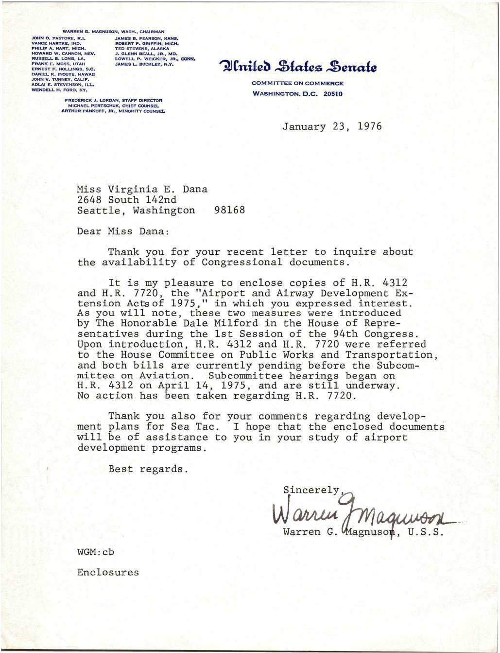 Thank you for your recent letter to inquire about the availability of Congressional documents. It is my pleasure to enclose copies of H. R. 4312 and H.R. 7720, the "Airport and Airway Development Ex- tension Acts of 1975," in which you expressed interest . As you will note, these two measures were introduced by The Honorable Dale Milford in the House of Repre- sentatives during the 1st Session of the 94th Congress. Upon introduction, H.R. 4312 and H.R. 7720 were referred to the House Committee on Public Works and Transportation, and both bills are currently pending before the Subcom- mittee on Aviation. Subcommittee hearings began on H.R. 4312 on April 14, 1975, and are still underway. No action has been taken regarding H.R. 7720. Thank you also for your comments regarding develop- ment plans for Sea Tac. I hope that the enclosed documents' will be of assistance to you in your study of airport development programs. Best regards. ~i=~A~~ Warren G. ~a~~~sof, U.S.S. WGM:cb Enclosures