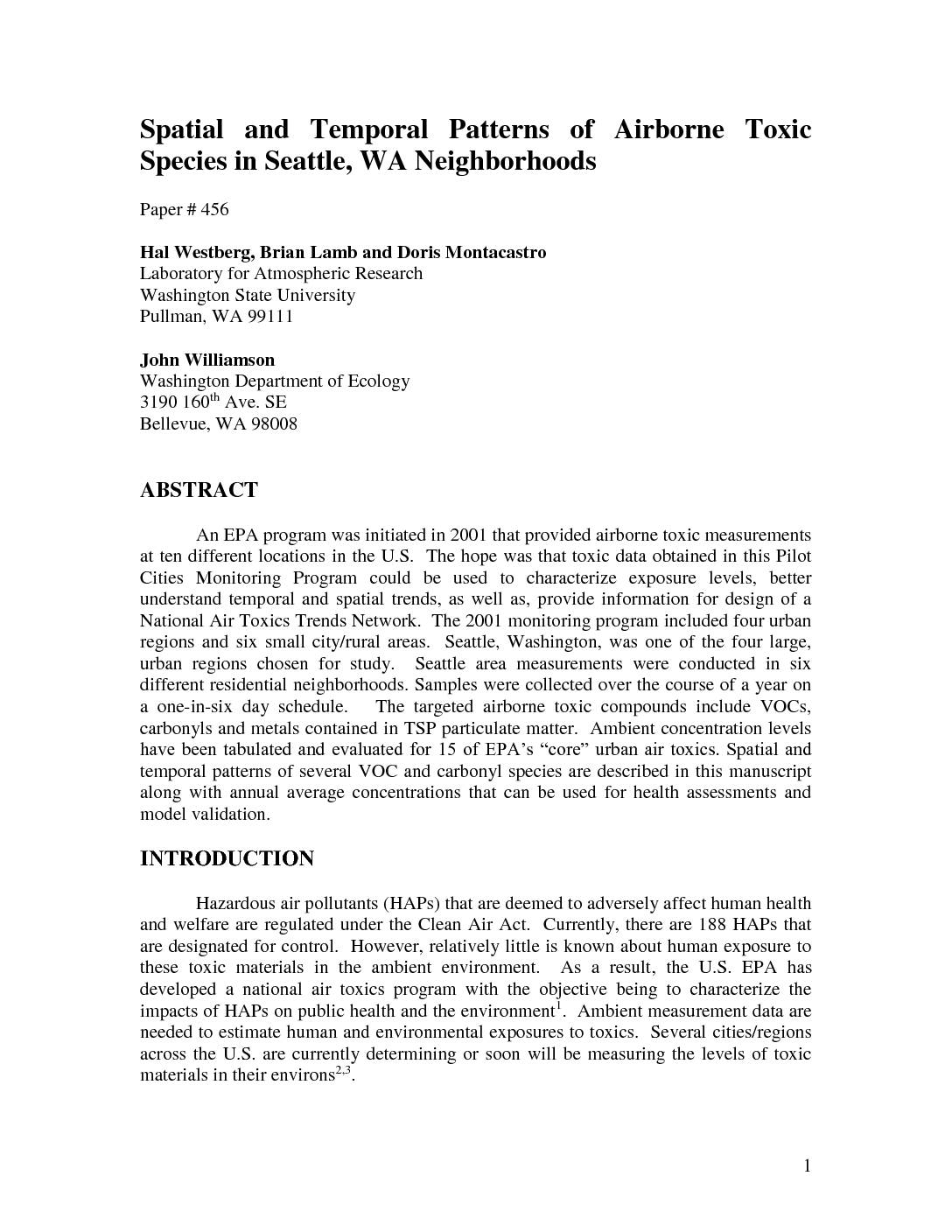 Spatial and Temporal Patterns of Airborne Toxic Species in Seattle, WA Neighborhoods Paper # 456 Hal Westberg, Brian Lamb and Doris Montacastro Laboratory for Atmospheric Research Washington State University Pullman, WA 99111 John Williamson Washington Department of Ecology 3190 160th Ave. SE Bellevue, WA 98008 -
