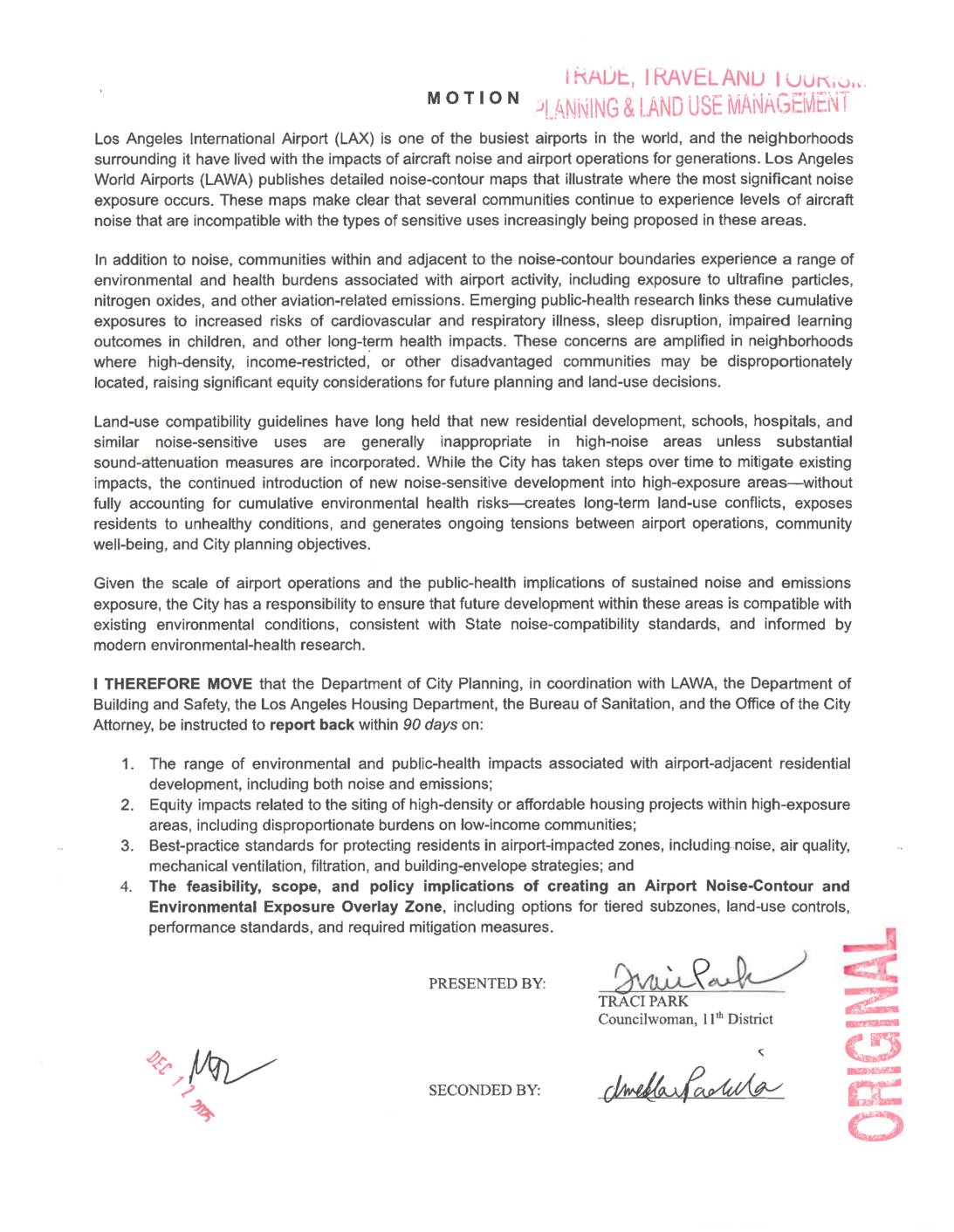 Motion presented by Councilwoman Traci Park requesting the Department of City Planning to report back within 90 days on creating an Airport Noise-Contour and Environmental Exposure Overlay Zone. The motion addresses environmental and health impacts of airport-adjacent residential development, equity concerns for low-income communities, and best-practice standards for protecting residents in airport-impacted areas.