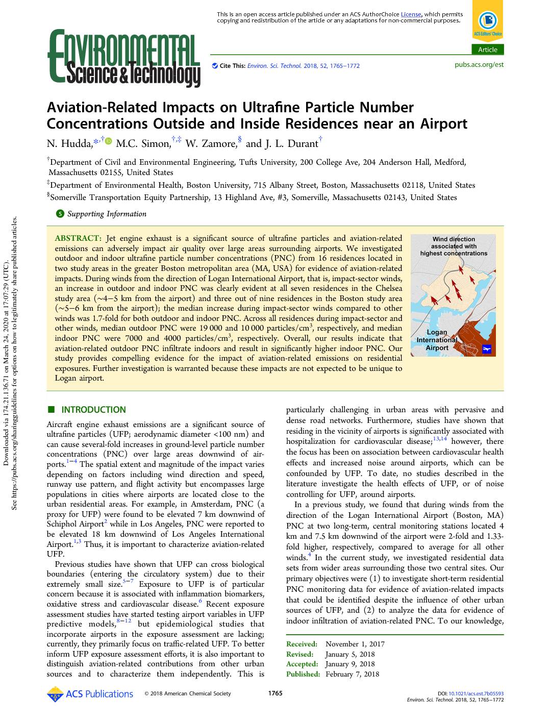 Concentrations Outside and Inside Residences near an Airport N. Hudda,*,† M.C. Simon,†,‡ W. Zamore,§ and J. L. Durant† †Department of Civil and Environmental Engineering, Tufts University, 200 College Ave, 204 Anderson Hall, Medford, Massachusetts 02155, United States ‡Department of Environmental Health, Boston University, 715 Albany Street, Boston, Massachusetts 02118, United States §Somerville Transportation Equity Partnership, 13 Highland Ave, #3, Somerville, Massachusetts 02143, United States *S Supporting Information ABSTRACT: Jet engine exhaust is a significant source of ultrafine particles and aviation-related emissions can adversely impact air quality over large areas surrounding airports. We investigated outdoor and indoor ultrafine particle number concentrations (PNC) from 16 residences located in two study areas in the greater Boston metropolitan area (MA, USA) for evidence of aviation-related impacts. During winds from the direction of Logan International Airport, that is, impact-sector winds, an increase in outdoor and indoor PNC was clearly evident at all seven residences in the Chelsea study area (∼4−5 km from the airport) and three out of nine residences in the Boston study area (∼5−6 km from the airport); the median increase during impact-sector winds compared to other winds was 1.7-fold for both outdoor and indoor PNC. Across all residences during impact-sector and other winds, median outdoor PNC were 19 000 and 10 000 particles/cm3, respectively, and median indoor PNC were 7000 and 4000 particles/cm3, respectively. Overall, our results indicate that aviation-related outdoor PNC infiltrate indoors and result in significantly higher indoor PNC. Our study provides compelling evidence for the impact of aviation-related emissions…