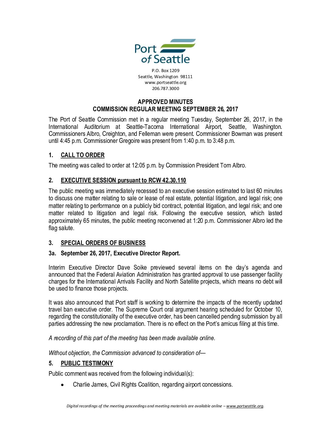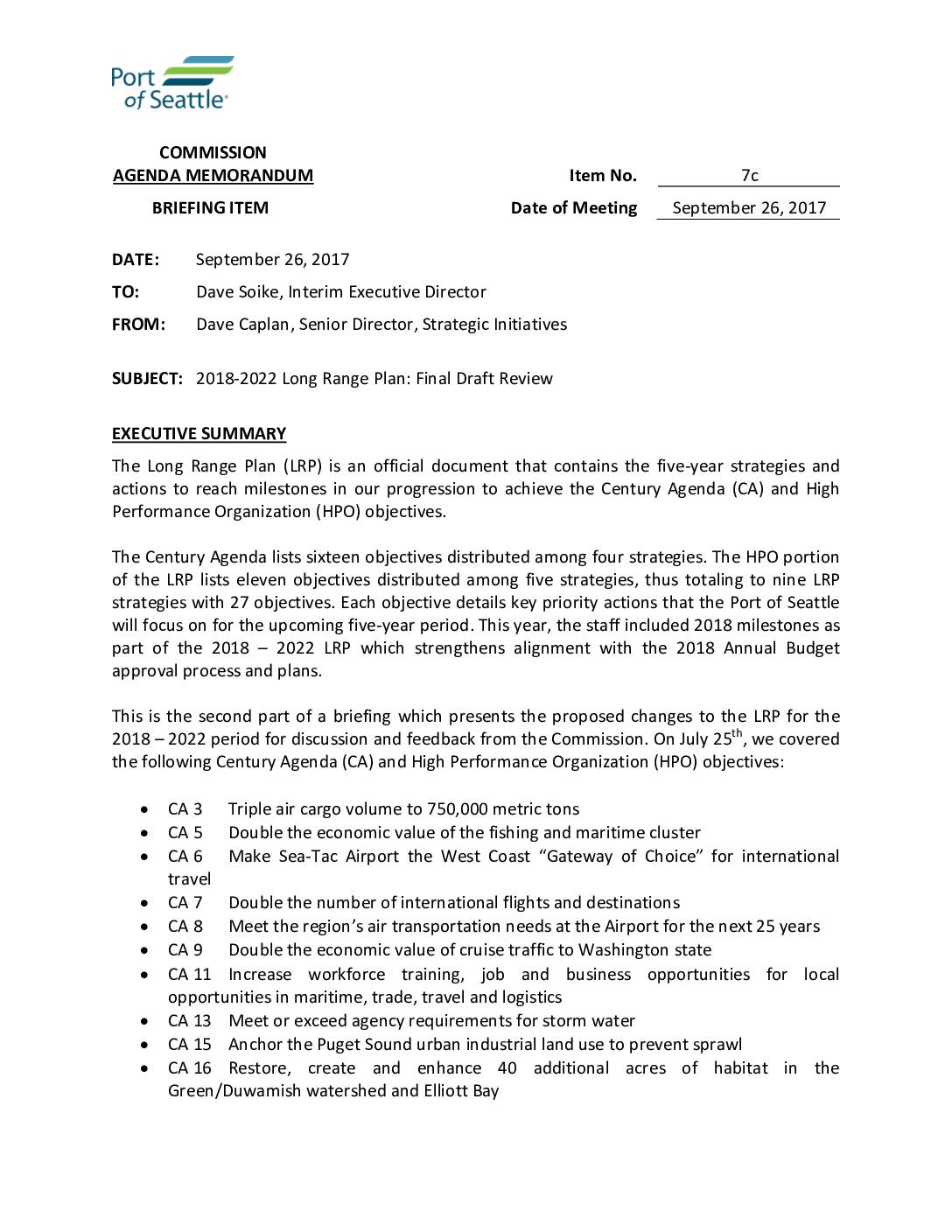 The mission of the Port of Seattle is to create economic opportunity and stronger communities by advancing trade and commerce, promoting manufacturing and maritime growth, and improving our environment for current and future generations. Our vision is to add 100,000 jobs through economic growth led by the Port, for a total of 300,000 port-related jobs in the region, while reducing our environmental footprint. We are committed to creating opportunity for all, partnering with surrounding communities, promoting social respon- sibility, conducting ourselves transparently, and holding ourselves accountable for improving the environment. The Port of Seattle uses a rolling 5-year Long Range Plan (LRP) to focus our efforts on job growth and strategic objectives established by the Commission in the Century Agenda (see page 5). Over the last two years, the LRP has helped the Port align programs to achieve the Port’s Century Agenda. For each strategic objective, the LRP sets out the key actions and performance mea- sures to guide the work and monitor progress. All Port divisions participate in the LRP through cross-departmental teams formed around strategic objectives. The LRP shapes the annual budget and ensures that all Port divisions have specific, achievable actions to keep up with the dramatic growth in our industries and create economic opportunities for all in our community. The intention of the LRP is to bring all capabilities of the Port to bear in the work of achieving the economic and environmental goals that the Commission and public have identified as most pressing for our…