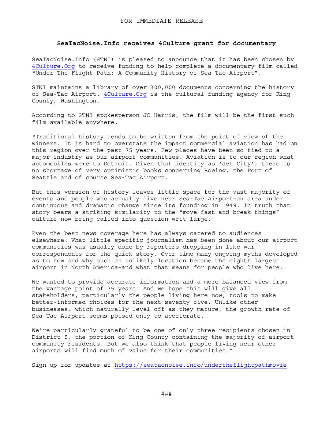 • SeaTacNoise.Info – 4Culture Grant for Documentary (Press Release PR20630)