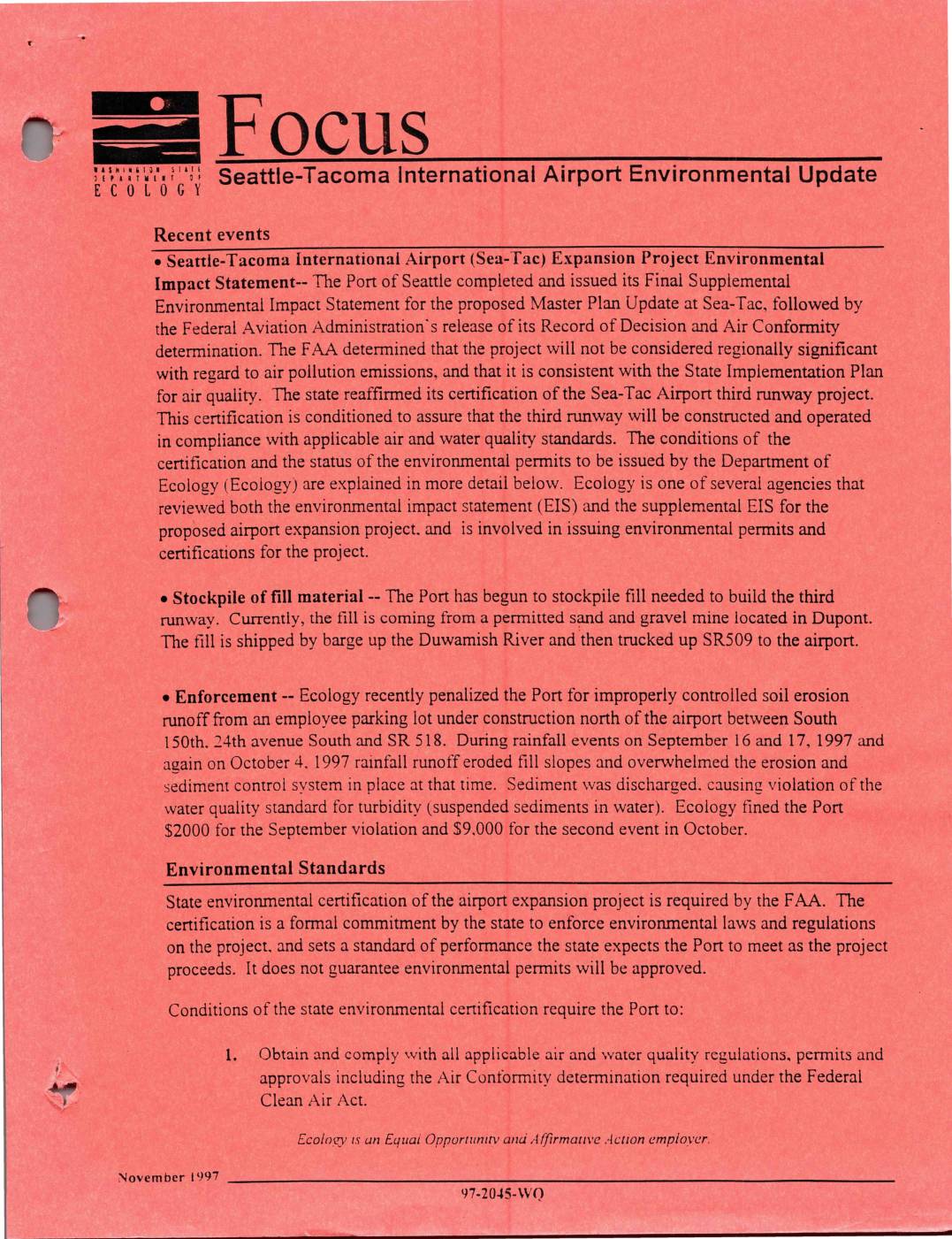 =i-e-Tacoma International Airport (Sea.-Tac) Expansion Project Environmental mp,ICt Statement-- The Port of Seattle completed and issued its Final Supplemental ,nvironmental Impact Statement for the proposed Master Plan Update at Sea-Tac. followed by the Federal Aviation Administration's release of its Record of Decision and Air Conformity determination. The FM determined that the project will not be considered regionally sigIdficant with regard to air pollution emissions, and that it is consistent with the State Implementation Plan ,r dir quality. The state reaffirmed its certification of the Sea-Tac Airport third runway project is certification is conditioned to assure that the third runway will be constructed and operated in compliance with applicable air and water quality standards. The conditions of the ,rtification uld the status of the environmental permits to be issued by the Department of ,c.ojogy (Ecology) are explained in more detail below. Ecology is one of several agencies that reviewed both the environmental impact statement (EIS) and the supplemental EIS for the proposed airport expansion project. and is involved in issuing environmental permits and ,ertifications for the project , Stockpile of fill material '-- The Port has begun to stockpile fill needed to build the third runway. CWTently, the fill is coming from a permitted spd and gravel mine located in Dupont. The fill is shipped by barge up the Duwamish River and then trucked up SR509 to the airport. , Enforcement – Ecology recently penalized the Port for improperly controlled soil erosion runoff from an employee parking lot under construction north… -