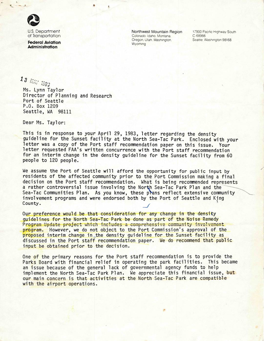 FAA – Letter re North Sea-Tac Park Density Guideline Change, May 13, 1982
