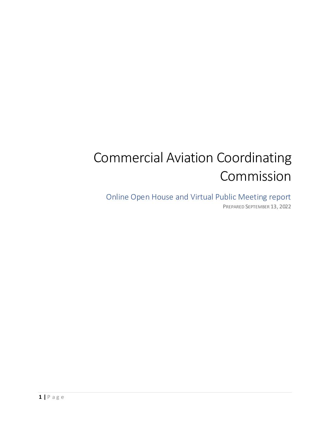 Online Open House and Virtual Public Meeting report PREPARED SEPTEMBER 13, 2022 | P a g e Executive Summary Overview Learning more about what is important to communities across Washington state is a crucial step for the CACC. To help learn about aviation priorities, the CACC held an online open house from August 15 to September 11, 2022. The online open house was available in English, Amharic, Arabic, Chinese (simplified and traditional), French, Japanese, Korean, Russian, Somali, Spanish, Tagalog, Thai, Tigrinya, and Vietnamese languages. Additionally, there was a call-in option for people who wanted the open house read to them, and two virtual public meetings held via Zoom on August 23 and 31, 2022. Promotion The primary audience for notification of the online open house was Washington residents west of the Cascades. The intent was to reach communities around the 10 greenfield locations as well as Bremerton National and Paine Field. Residents in the rest of the state were a secondary statewide audience. To promote the online open house, WSDOT distributed a press release in English and Spanish to statewide media; distributed partner toolkits to CACC members and CBOs who requested copies; and published organic and paid social media posts. Input The online open house received nearly 60,000 page views from an estimated 20,000 users. Of users, 1,121 provided their zip codes. Most users were from Washington state, with one participant from outside of Washington. The highest number of participants was from King County (392), followed by Thurston (209), Skagit…