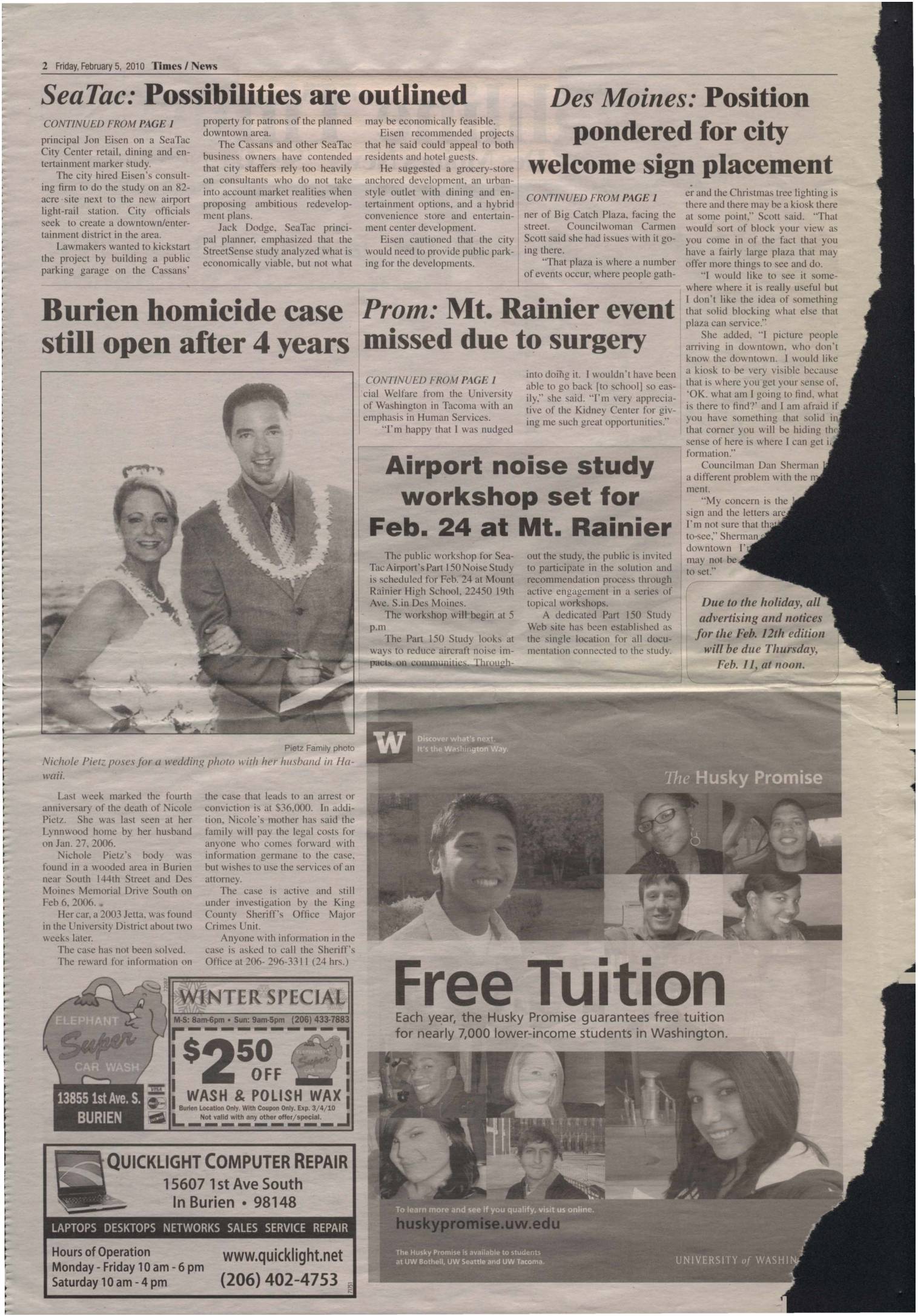 Friday, February 5, 2010 Times I News SeaTac: Possibilities are outlined Des Moines: Position pondered for city welcome sign placement CONTINUED FROM PAGE 1 principal Jon Eisen on a SeaTac City Center retail, dining and en- tertainment marker study. The city hired Eisen's consult- ing firm to do the study on an 82- acre site next to the new airport light-rail station. City officials seek to create a downtown/enter- tainment district in the area. Lawmakers wanted to kickstart the project by building a public parking garage on the Cassans' property for patrons of the planned downtown area. The Cassans and other SeaTac business owners have contended that city taffers rely too heavily on consultants who do not take into account market realities when proposing ambitious redevelop- ment plans. Jack Dodge, SeaTac princi- pal planner, emphasized that the StreetSense study analyzed what is economically viable. but not what Burien homicide case still open after 4 years Pietz Family photo Nichole Piet-:. poses for a wedding photo a·ith her husband in Ha- wwt. Last week marked the fourth anniversary of the death of Nicole Pietz. She was last seen at her Lynnwood home by her husband on Jan. 27, 2006. Nichole Pietz's body was found in a wooded area in Burien near South 144th Street and Des Moines Memorial Drive South on Feb 6, 2006. Her car, a 2003 ]etta, was found in the University District about two weeks later. The case has not been solved. The reward for information on the… -